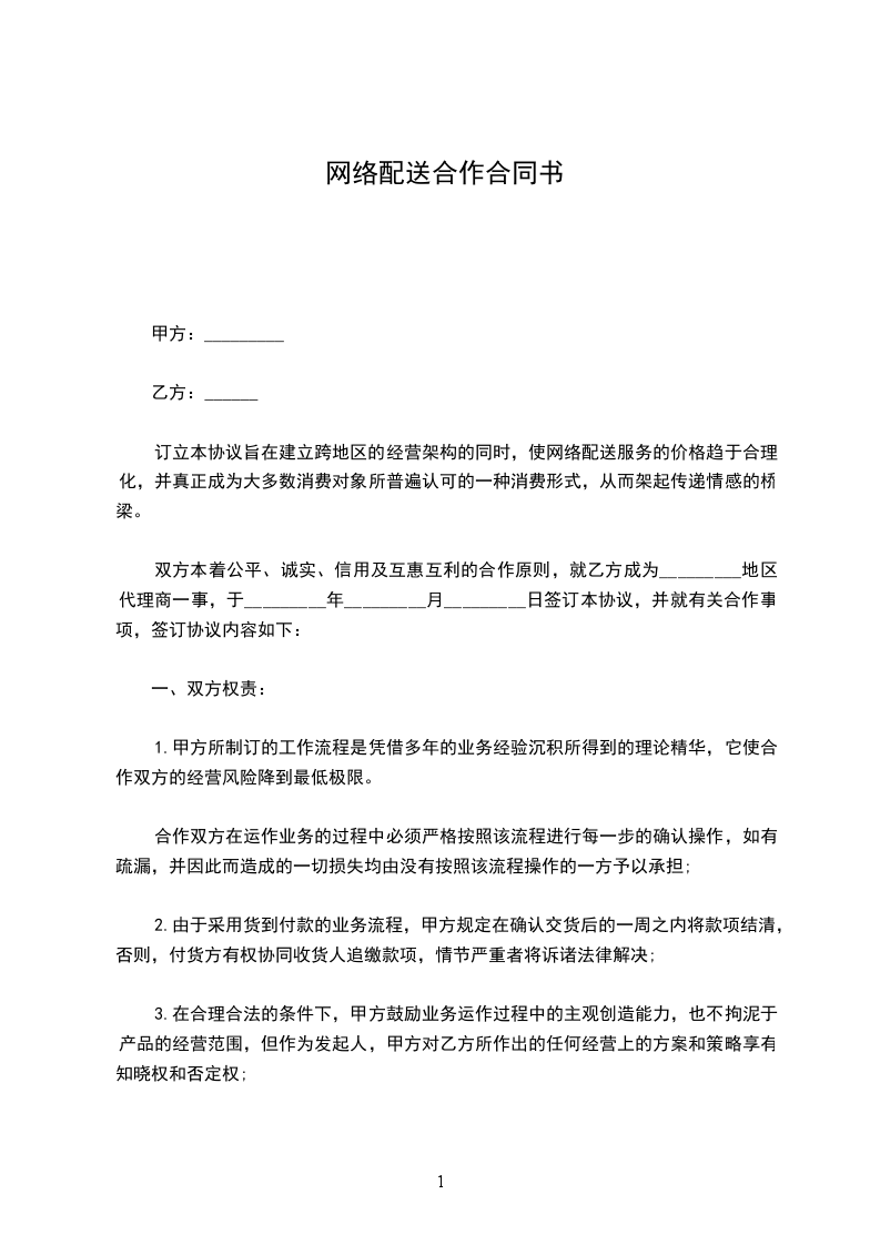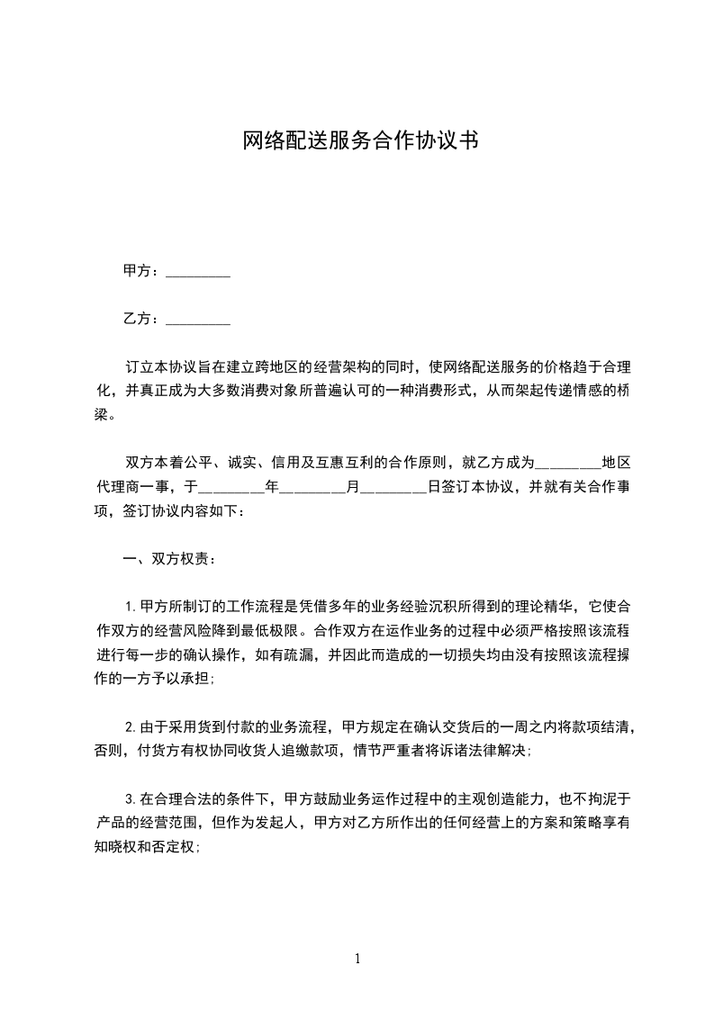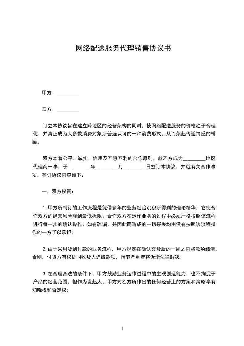 订立本协议旨在建立跨地区的经营架构的同时,使网络配送服务的价格趋于合理化,并真正成为大多数消费对象所普遍认可的一种消费形式,从而架起传递情感的桥梁。