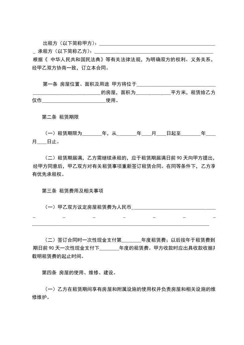 出租方(以下简称甲方):________________________________________________ 承租方(以下简称乙方):________________________________________________ 根据《 中华人民共和国民法典》等有关法律法规,为明确双方的权利、义务关系,经甲乙双方协商一致,订立本合同。