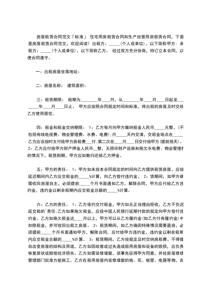 房屋租赁合同范文「标准」 住宅用房租赁合同和生产经营用房租赁合同,下面是房屋租赁合同范文,欢迎阅读! 出租方:_____(个人或单位),以下简称甲方; 承租方:_____(个人或单位),以下简称乙方。 经过双方充分协商,特订立本合同,以便合同遵守。