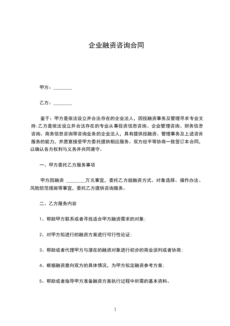 鉴于:甲方是依法设立并合法存在的企业法人,因投融资事务及管理寻求专业支持;乙方是依法设立并合法存在的专业从事投资信息咨询、企业管理咨询、财务信息咨询、商务信息咨询等咨询业务的企业法人,具有提供投融资、管理事务及上述咨询服务的能力,并愿意接受甲方委托提供相应服务。双方经平等协商一致签订本合同,以确认各方权利与义务并共同遵守。