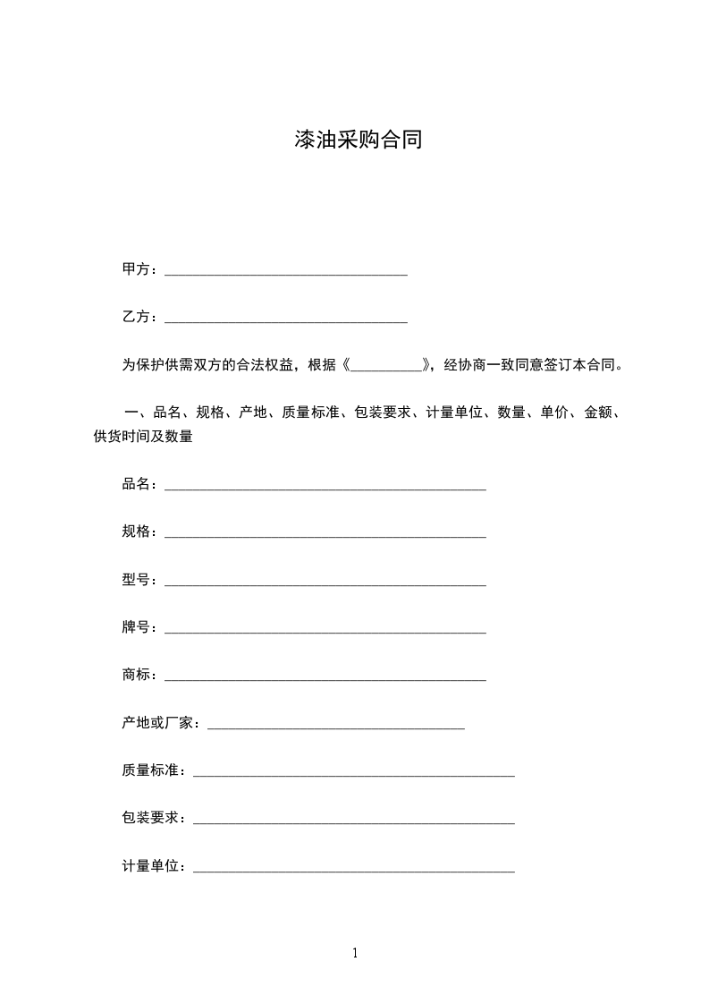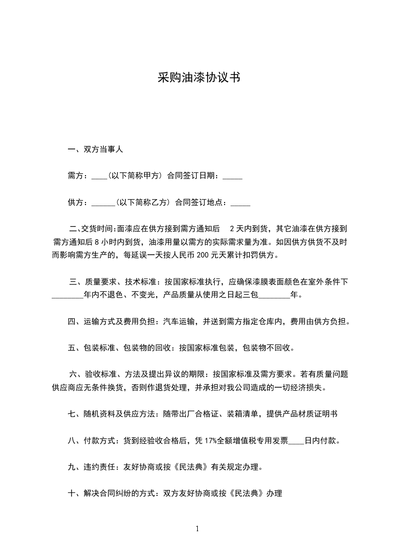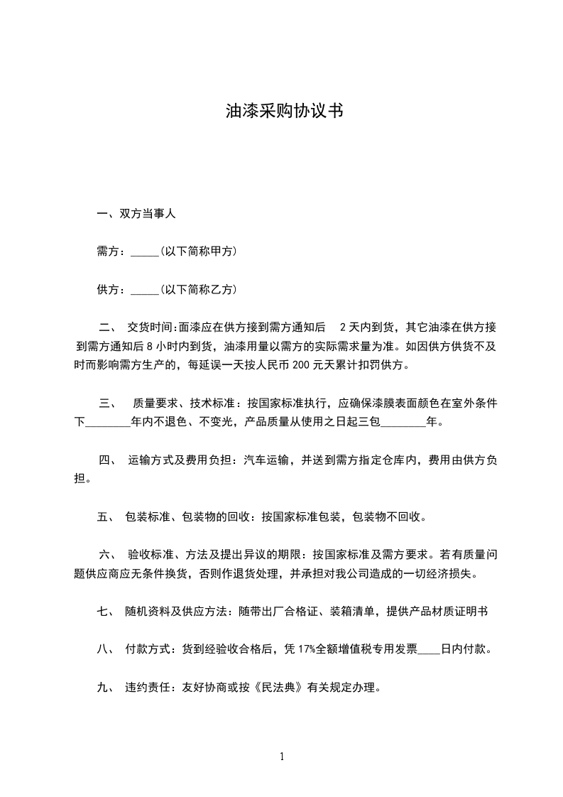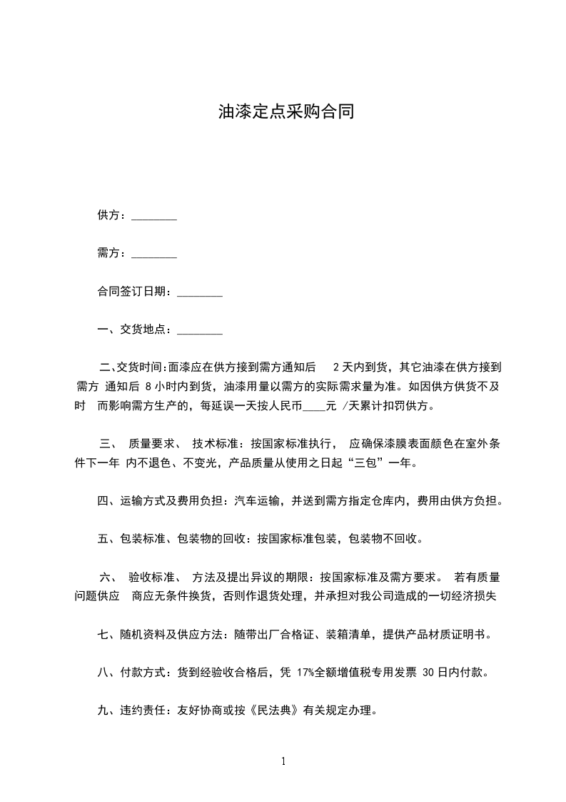 二、交货时间:面漆应在供方接到需方通知后2天内到货,其它油漆在供方接到需方通知后8小时内到货,油漆用量以需方的实际需求量为准。如因供方供货不及时而影响需方生产的,每延误一天按人民币_______元/天累计扣罚供方。