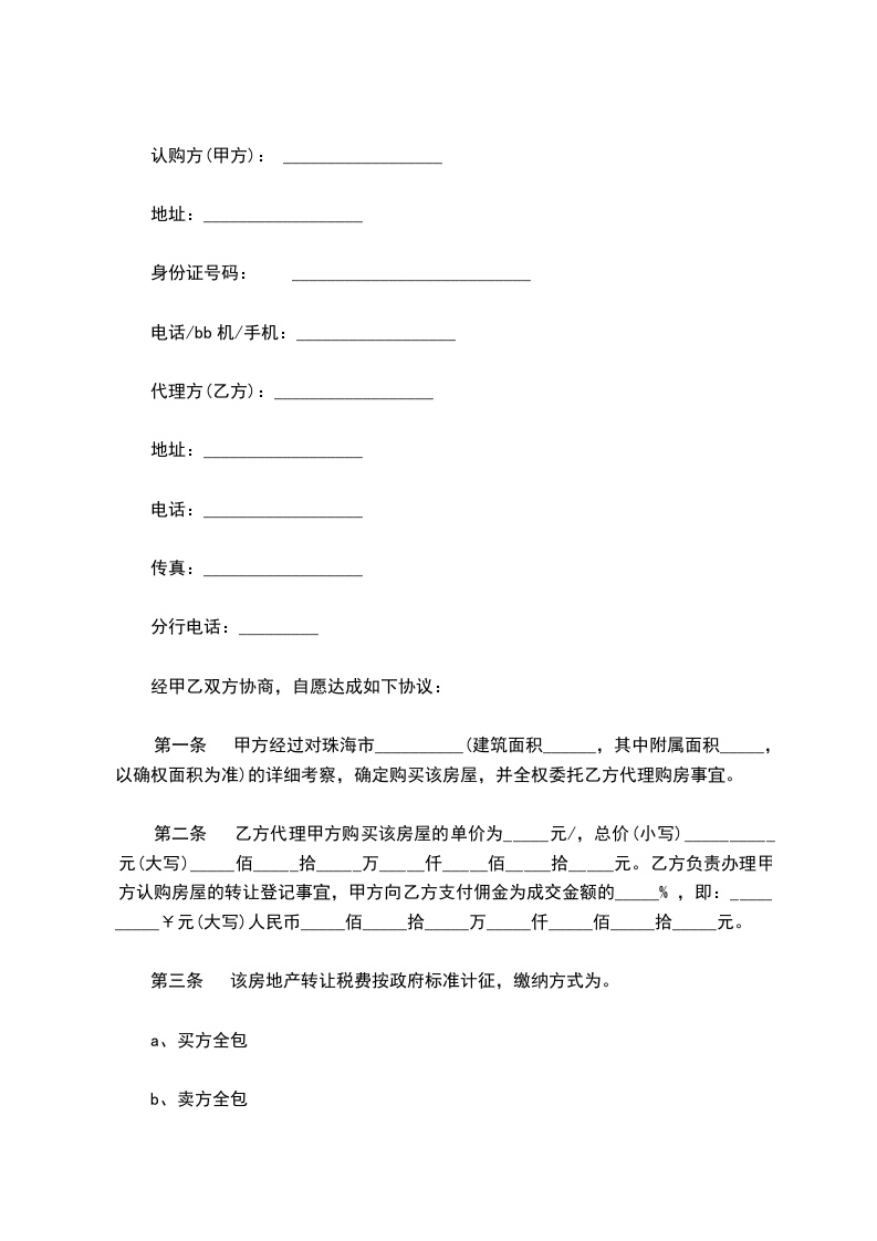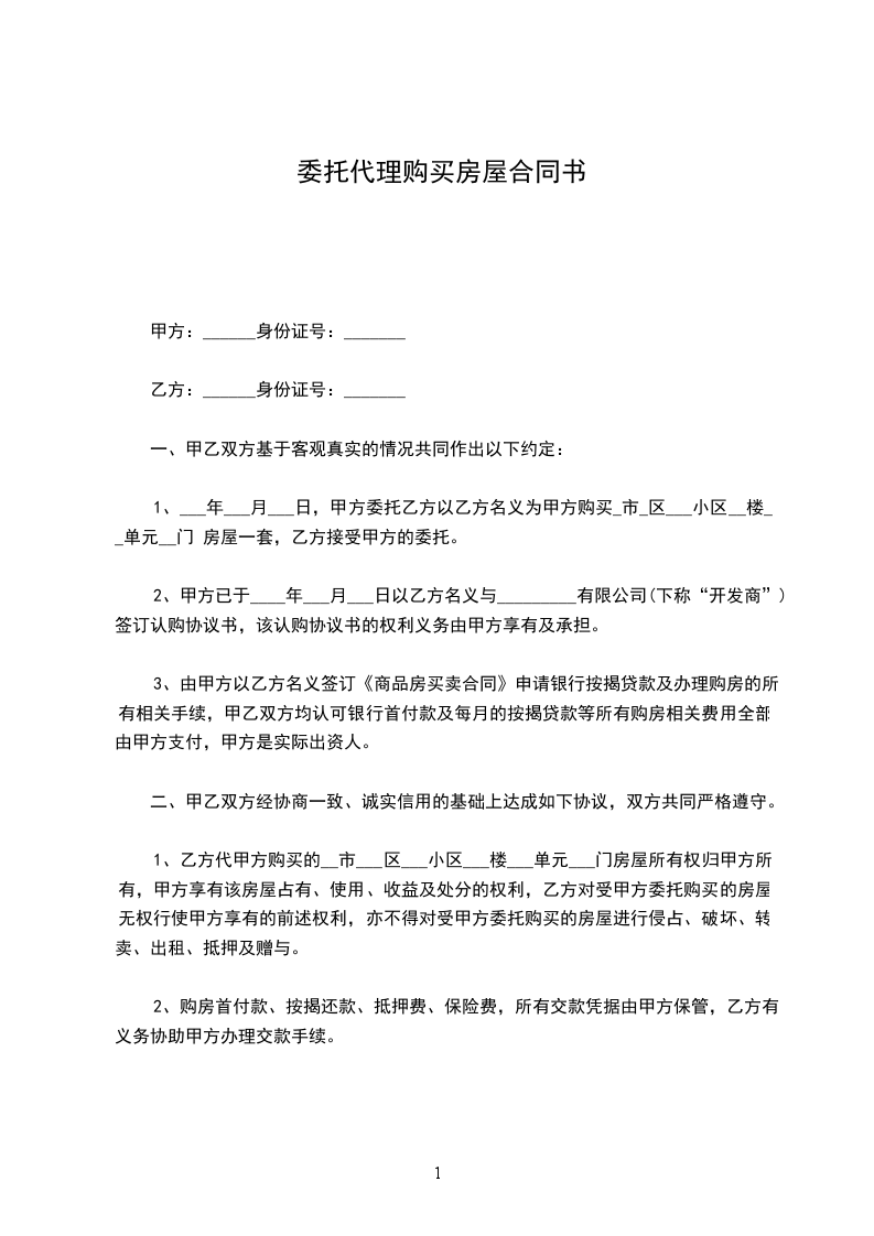 1、___年___月___日,甲方委托乙方以乙方名义为甲方购买_市_区___小区__楼__单元__门 房屋一套,乙方接受甲方的委托。