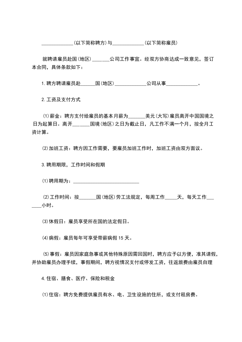 就聘请雇员赴国(地区)_______公司工作事宜。经双方协商达成一致意见,签订本合同,具体条款如下: