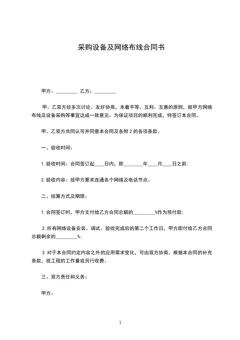 甲、乙双方经多次讨论、友好协商,本着平等、互利、互惠的原则,就甲方网络布线及设备采购等事宜达成一致意见。为保证项目的顺利完成,特签订本合同。