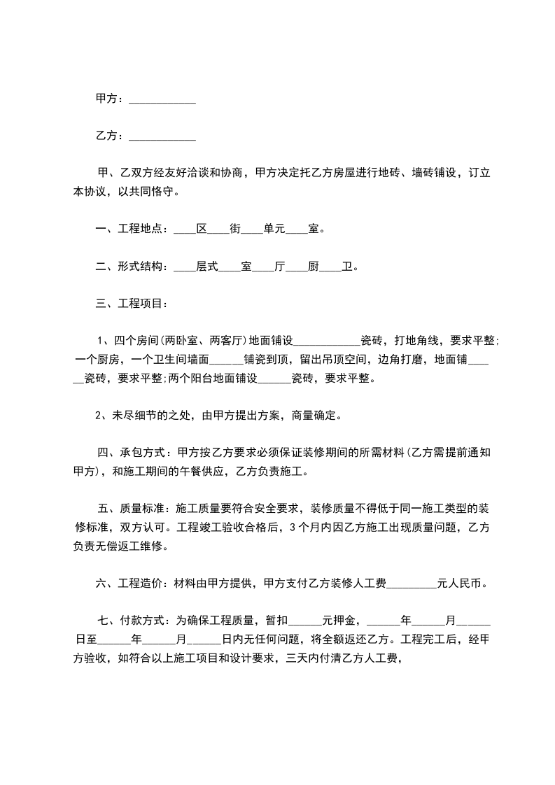 甲、乙双方经友好洽谈和协商,甲方决定托乙方房屋进行地砖、墙砖铺设,订立本协议,以共同恪守。