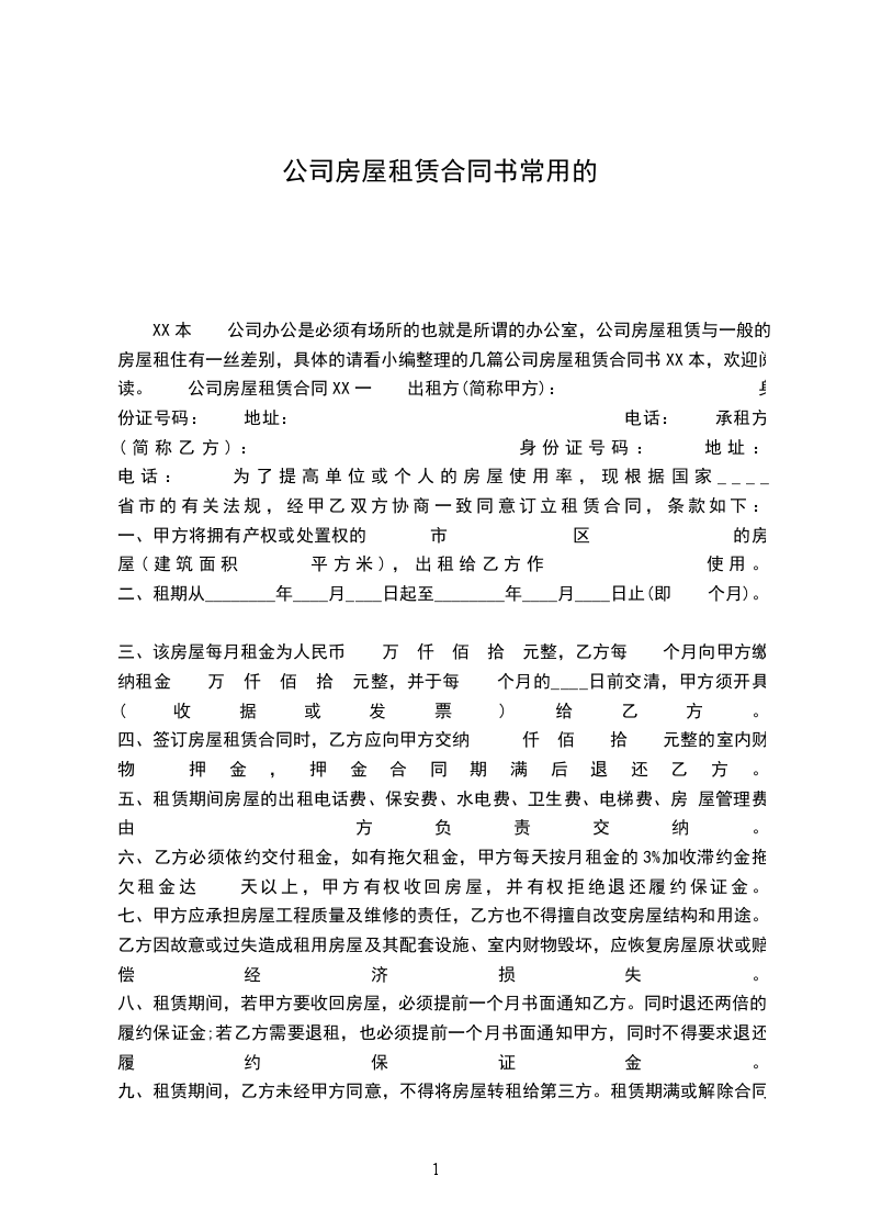 XX本 公司办公是必须有场所的也就是所谓的办公室,公司房屋租赁与一般的房屋租住有一丝差别,具体的请看小编整理的几篇公司房屋租赁合同书XX本,欢迎阅读。 公司房屋租赁合同XX一 出租方(简称甲方): 身份证号码: 地址: 电话: 承租方(简称乙方): 身份证号码: 地址: 电话: 为了提高单位或个人的房屋使用率,现根据国家____省市的有关法规,经甲乙双方协商一致同意订立租赁合同,条款如下: