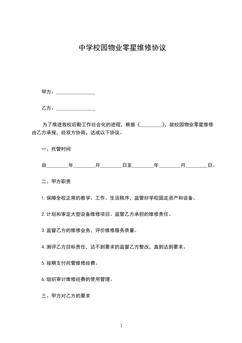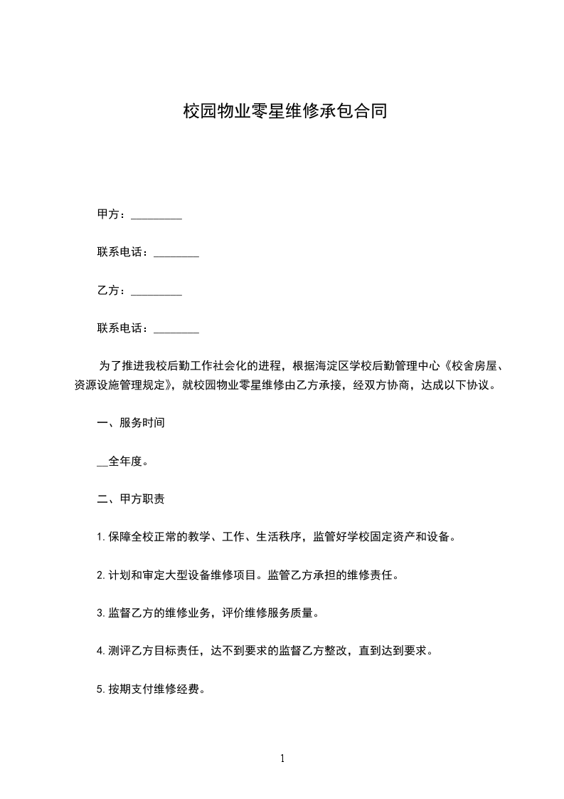 为了推进我校后勤工作社会化的进程,根据《_________》,就校园物业零星维修由乙方承接,经双方协商,达成以下协议。
