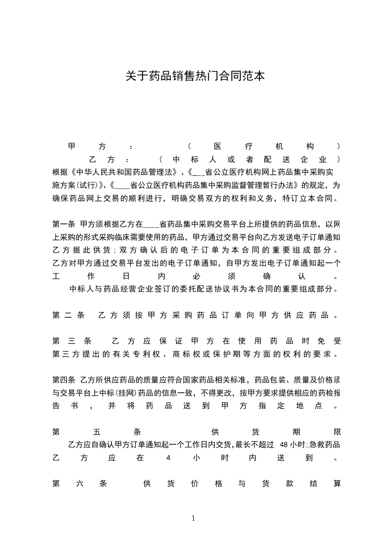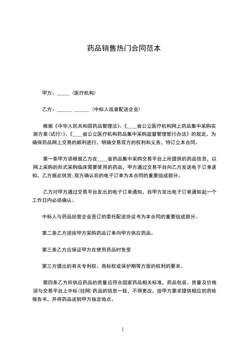 根据《中华人民共和国药品管理法》、《____省公立医疗机构网上药品集中采购实施方案(试行)》、《____省公立医疗机构药品集中采购监督管理暂行办法》的规定,为确保药品网上交易的顺利进行,明确交易双方的权利和义务,特订立本合同。