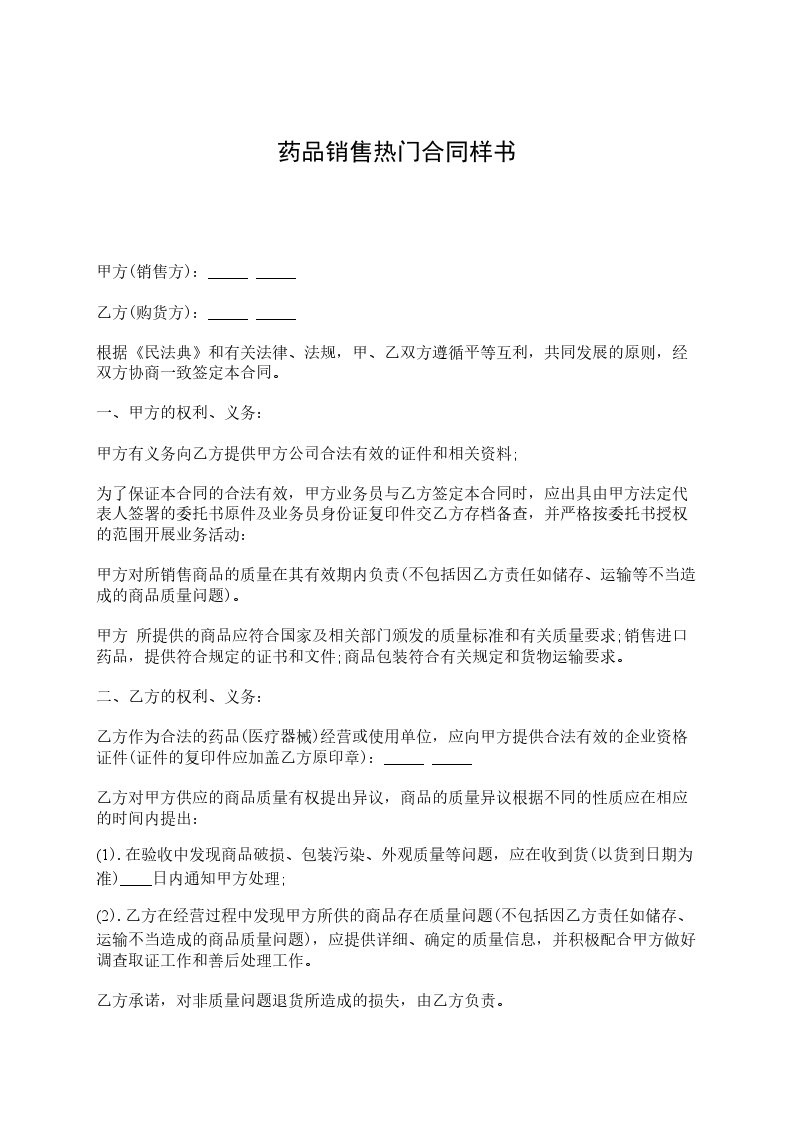 第四条 乙方所供应药品的质量应符合国家药品相关标准,药品包装、质量及价格须与交易平台上中标(挂网)药品的信息一致,不得更改,按甲方要求提供相应的药检报告书,并将药品送到甲方指定地点。