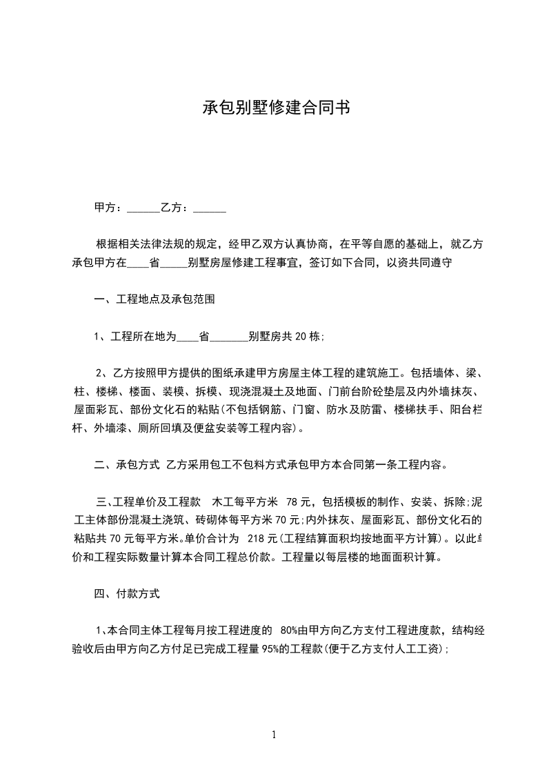 根据相关法律法规的规定,经甲乙双方认真协商,在平等自愿的基础上,就乙方承包甲方在____省_____别墅房屋修建工程事宜,签订如下合同,以资共同遵守