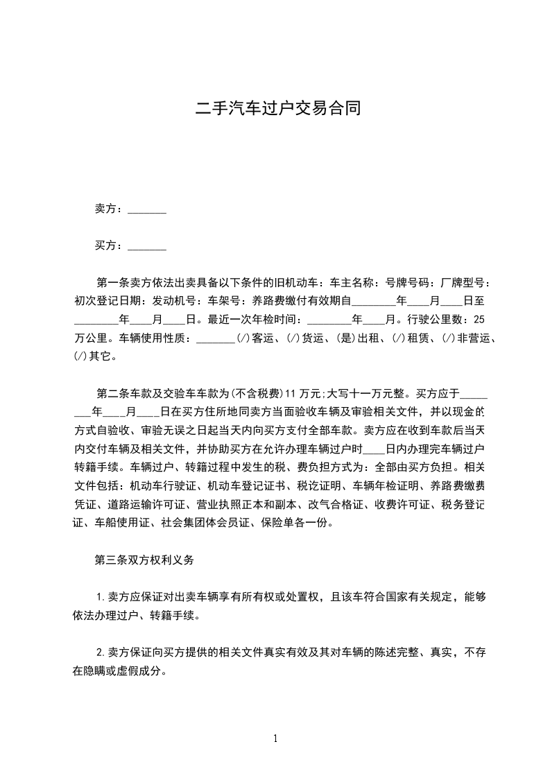 2.甲方须在本协议签订后______天内配合乙方办理车辆过户登记手续,在车辆过户至乙方名下后,乙方一次性现金支付剩余款项;