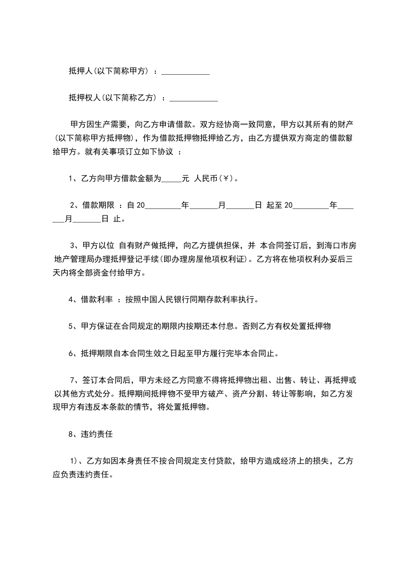 八、贷款到期后1个月,如借款方不归还贷款,贷款方有权依照法律程序处理借款方作为贷款抵押的物资和财产,抵还借款本息。