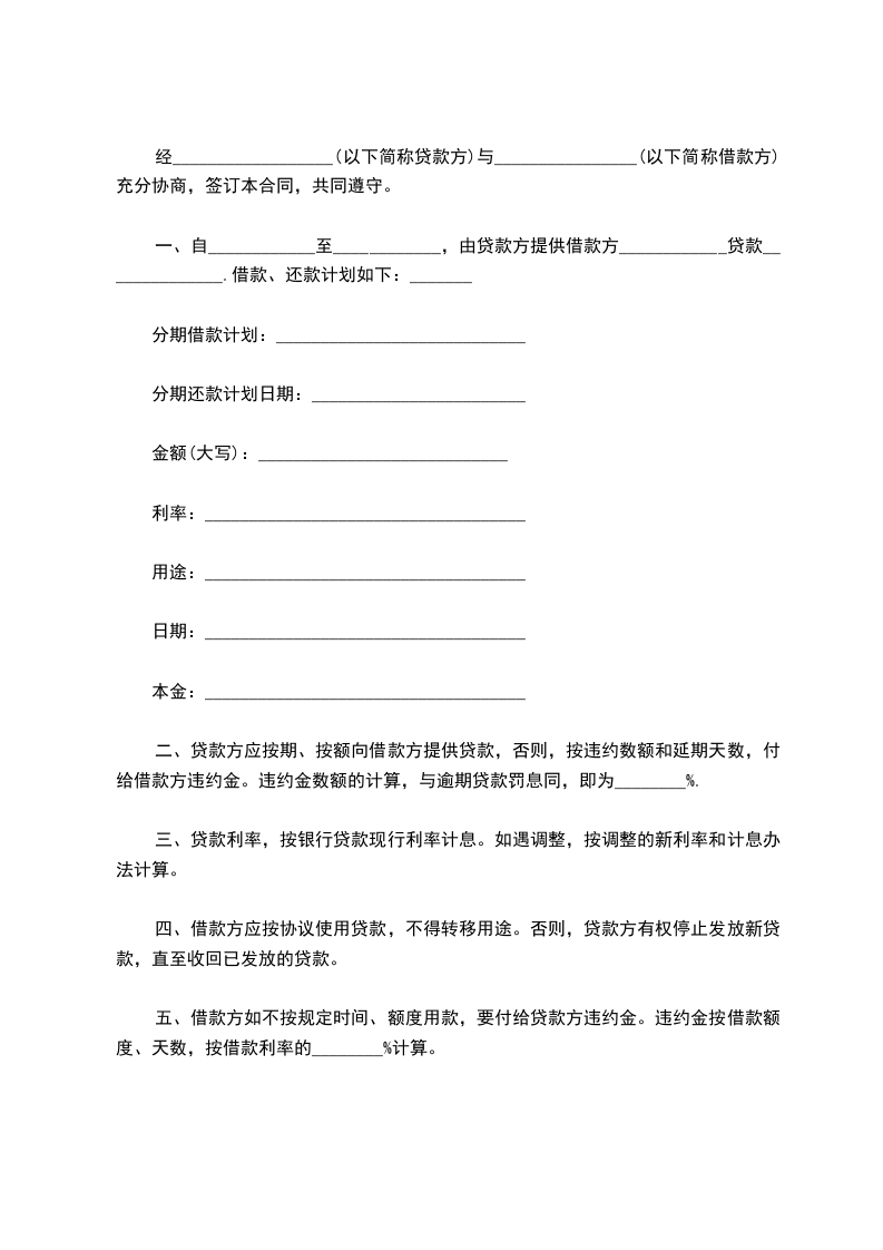 经__________________(以下简称贷款方)与________________(以下简称借款方)充分协商,签订本合同,共同遵守。