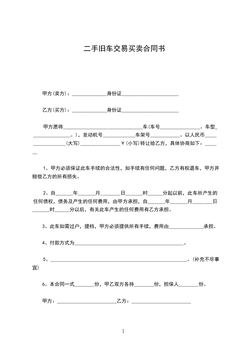 甲方愿将________________________________车(车号________________。车型________________。),发动机号_____________车架号____________。以人民币__________________(大写)________________¥(小写)转让给乙方,具体协商如下:_______