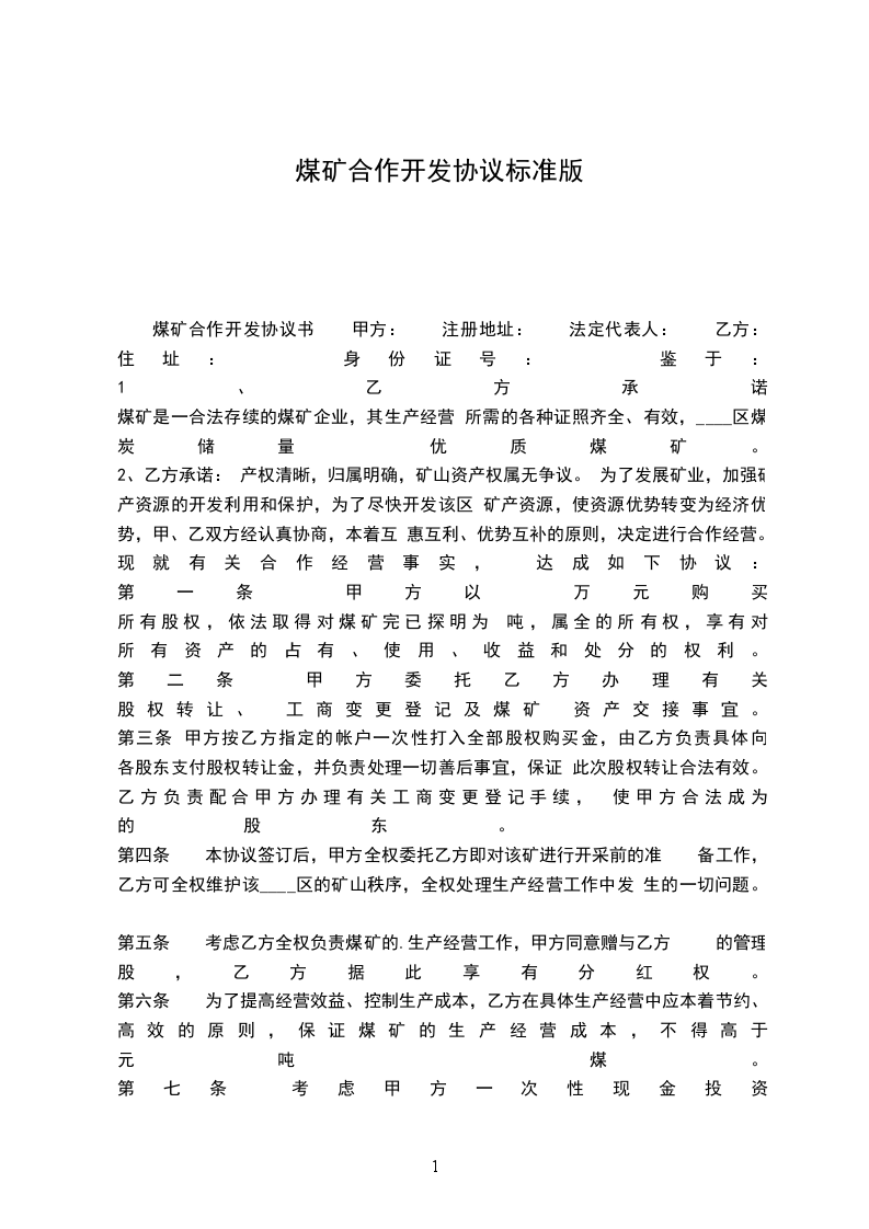 煤矿合作开发协议书 甲方: 注册地址: 法定代表人: 乙方: 住址: 身份证号: 鉴于: