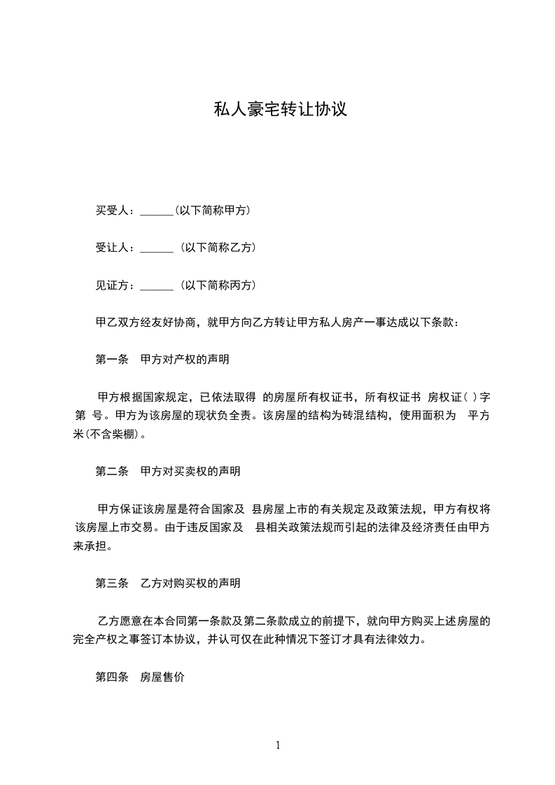 甲乙双方经友好协商,就甲方向乙方转让甲方私人房产一事达成以下条款: