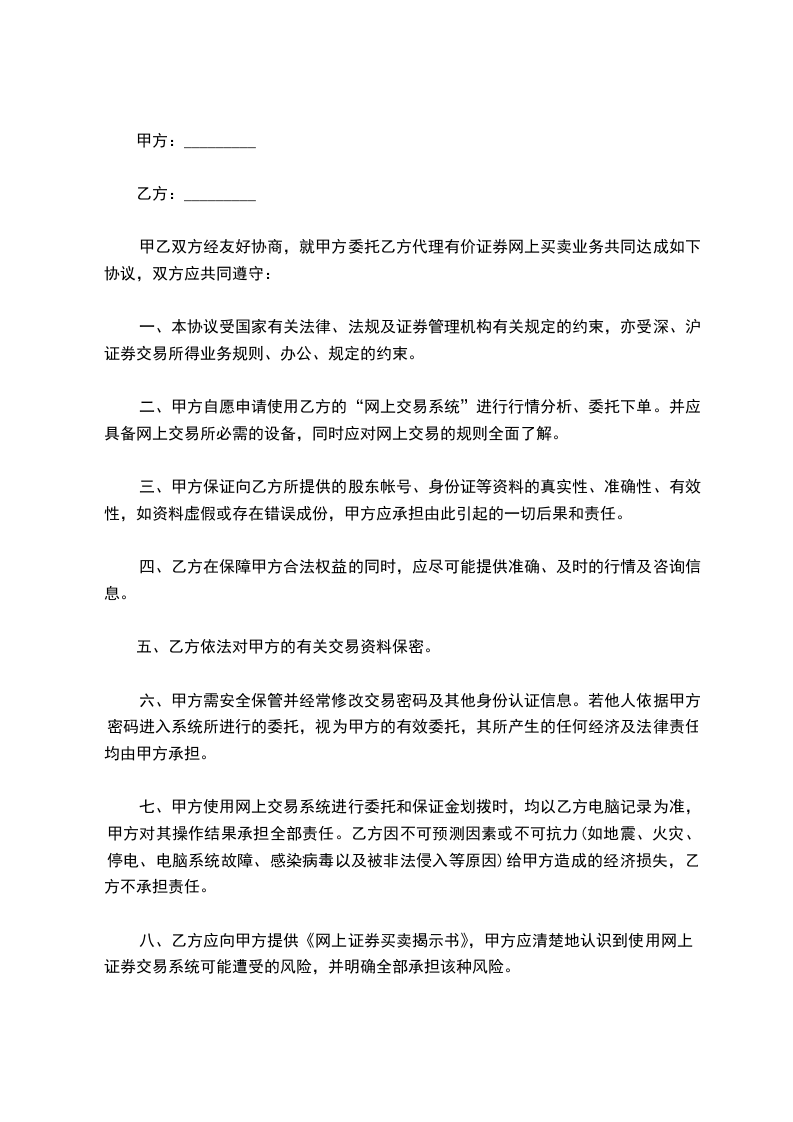 甲乙双方经友好协商,就甲方委托乙方代理有价证券网上买卖业务共同达成如下协议,双方应共同遵守: