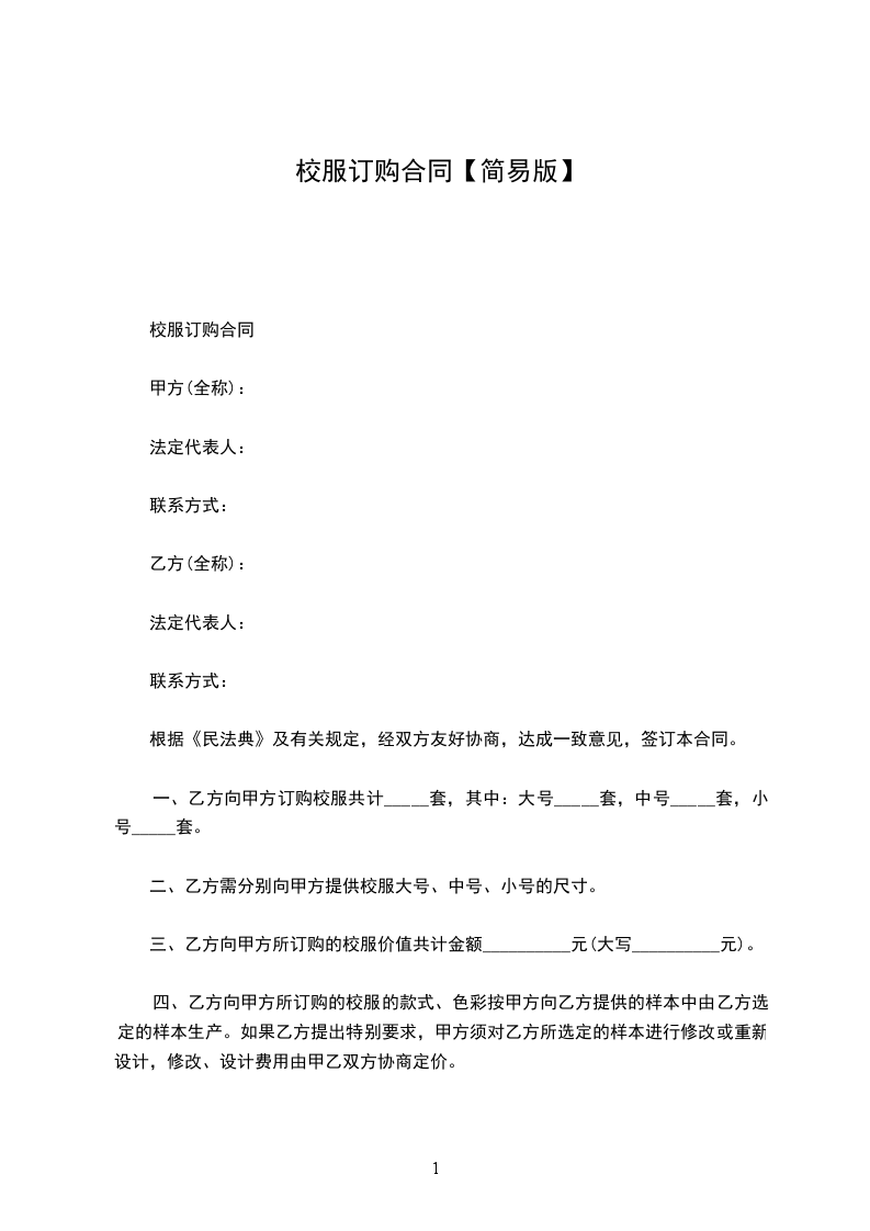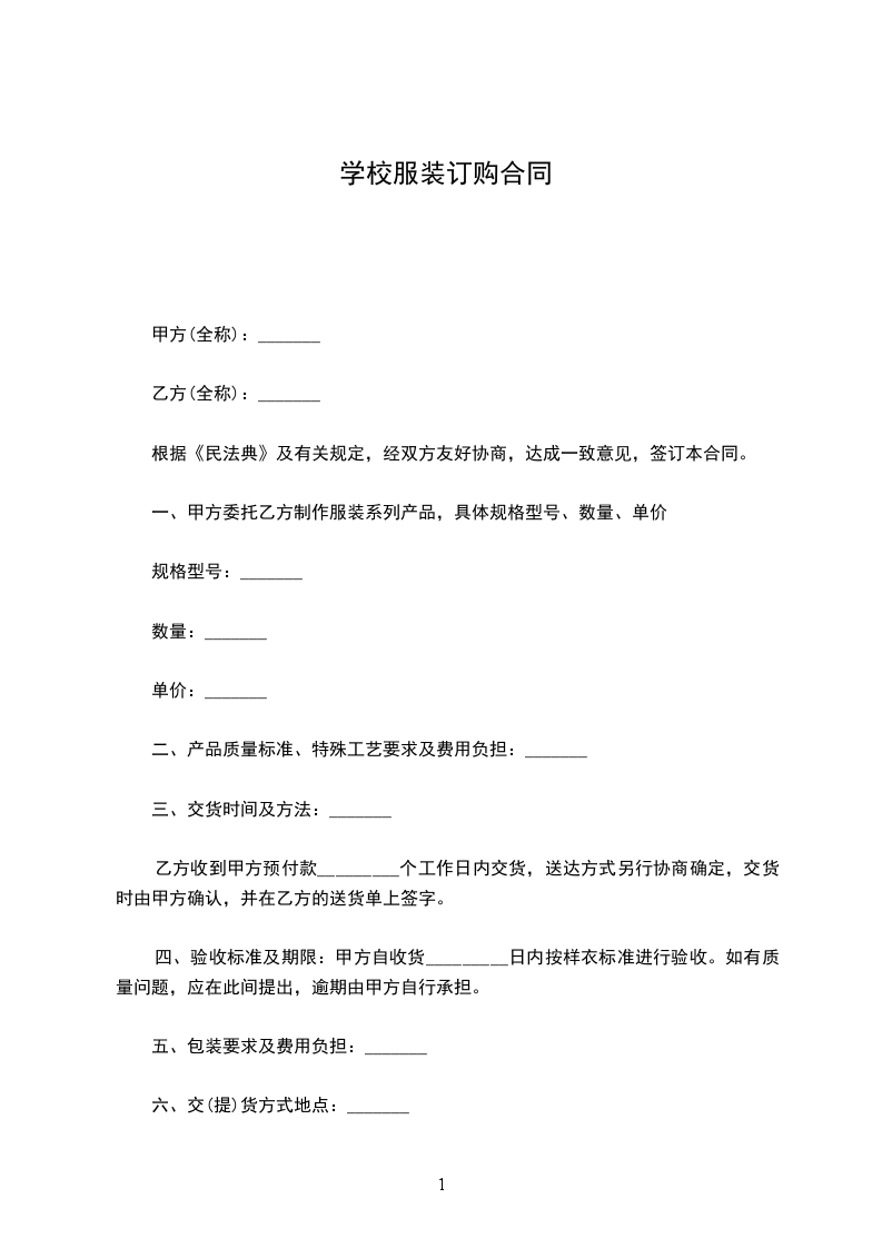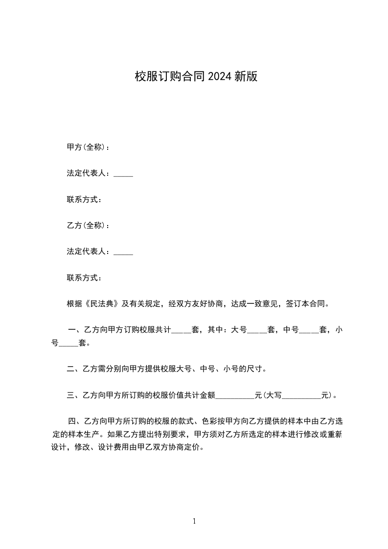 三、乙__向甲__所订购的校服价值共计金额___________元(大写 ____________ 元)。