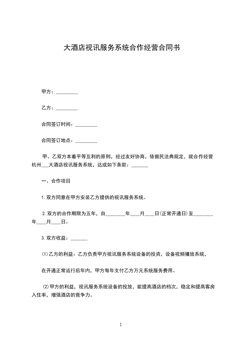 甲、乙双方本着平等互利的原则,经过友好协商,依据民法典规定,就合作经营杭州___大酒店视讯服务系统,达成如下条款:_______