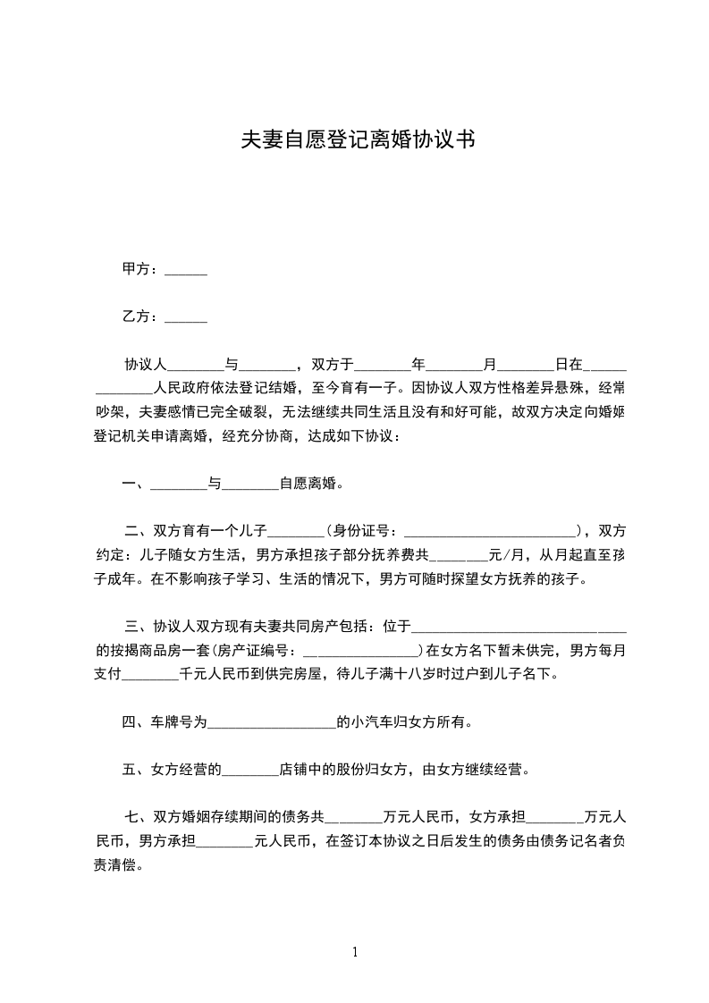 1、本协议一式________份,双方各执________份,交婚姻登记机关备案________份。