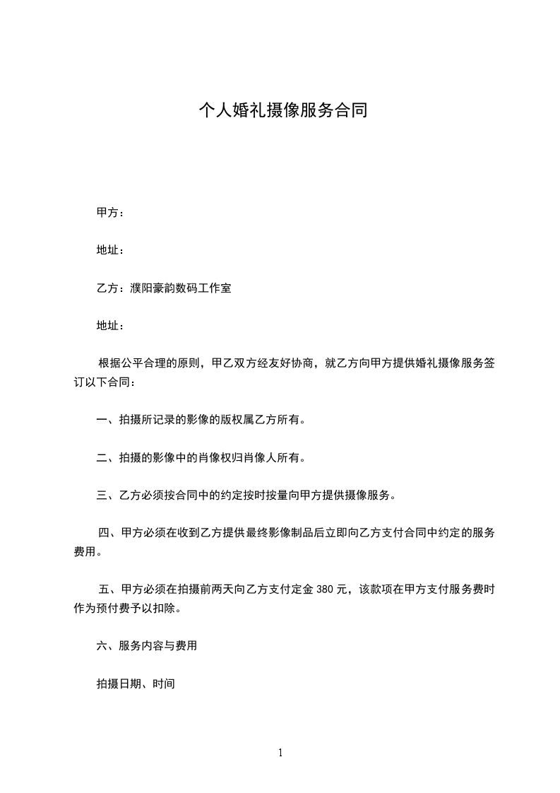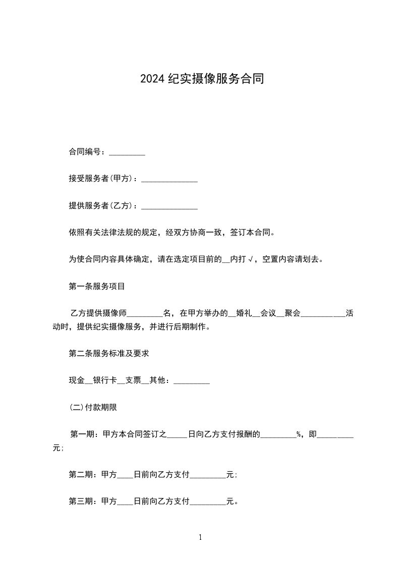 乙方提供摄像师_________名,在甲方举办的 __婚礼 __会议 __聚会 ___________活动时,提供纪实摄像服务,并进行后期制作。