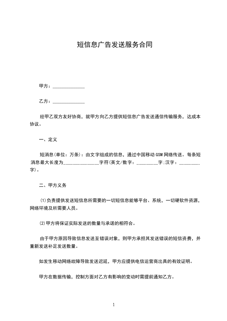 经甲乙双方友好协商,就甲方向乙方提供短信息广告发送通信传输服务,达成本协议。