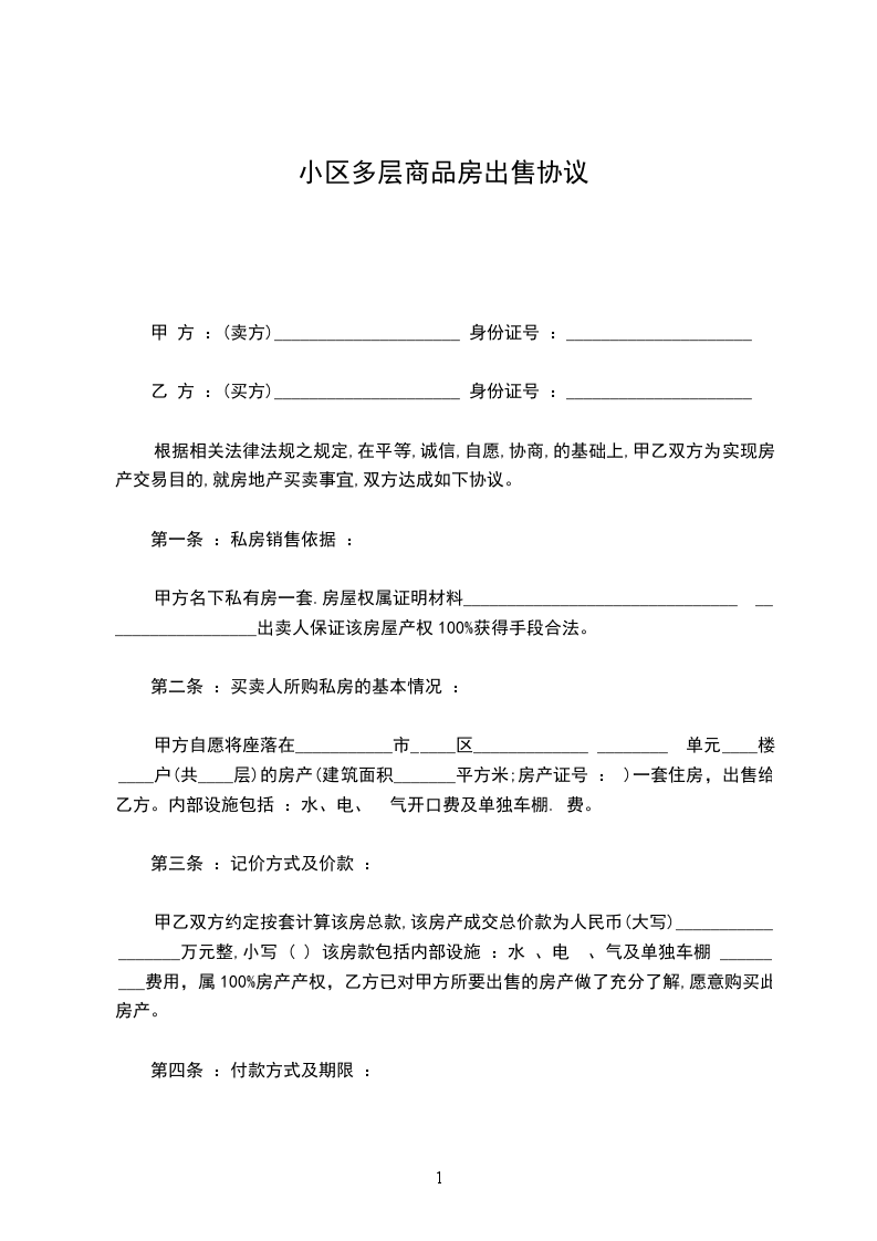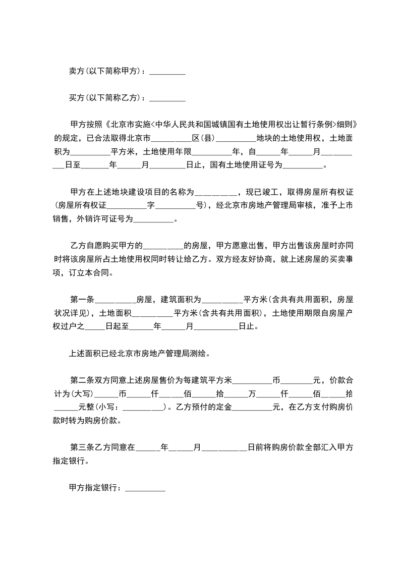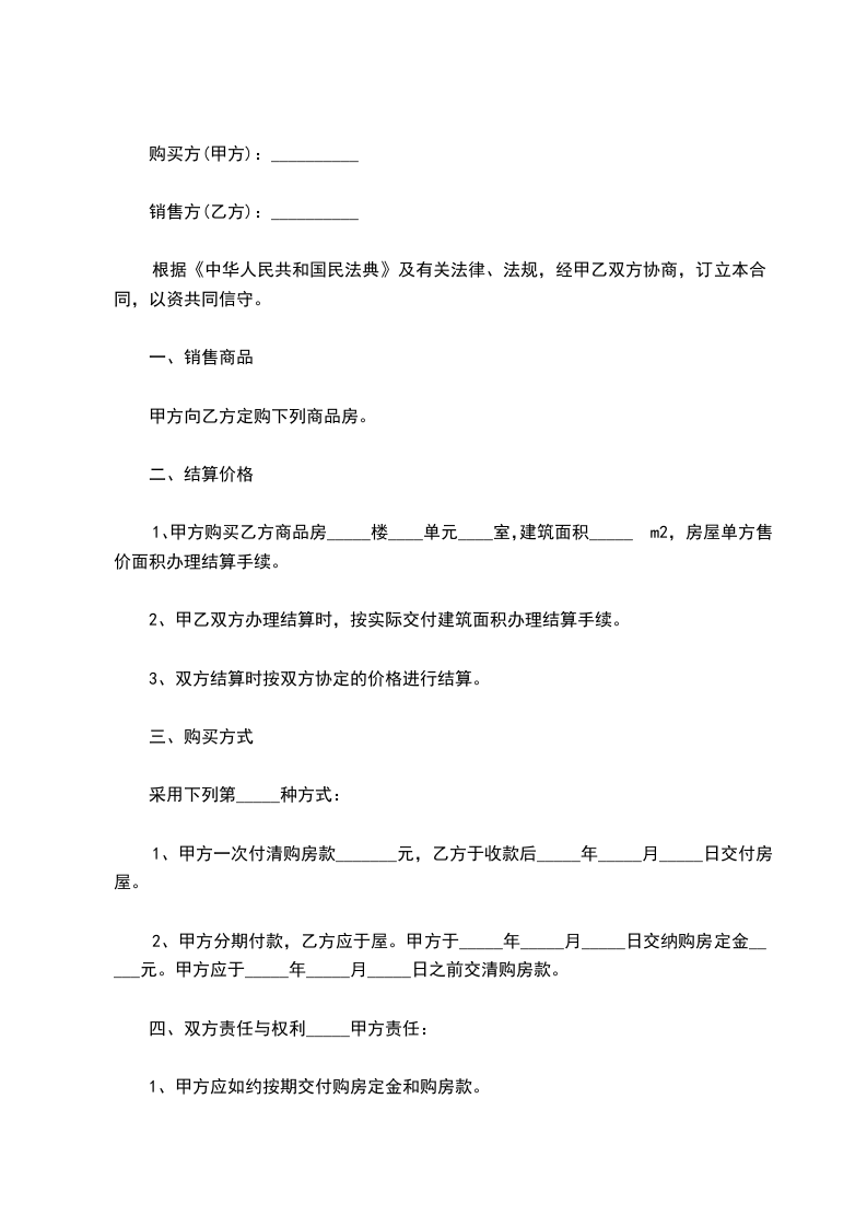 1、甲方购买乙方商品房_____楼____单元____室,建筑面积_____m2,房屋单方售价面积办理结算手续。