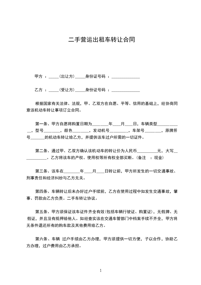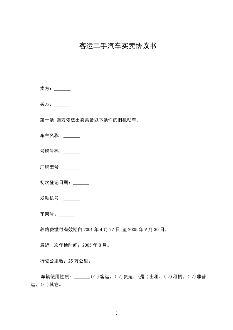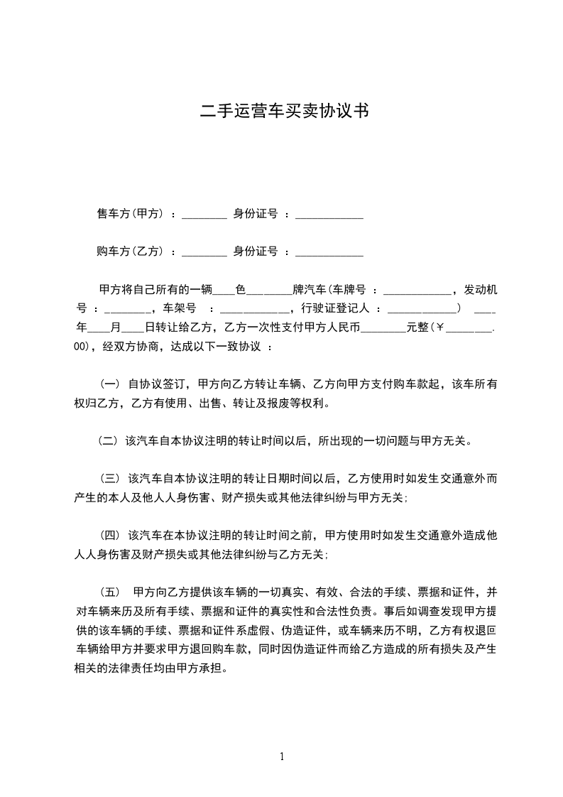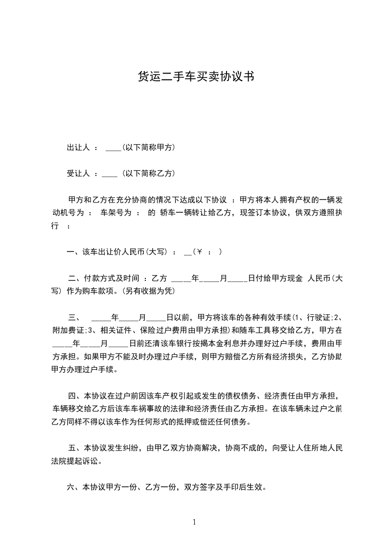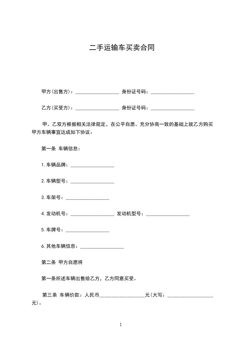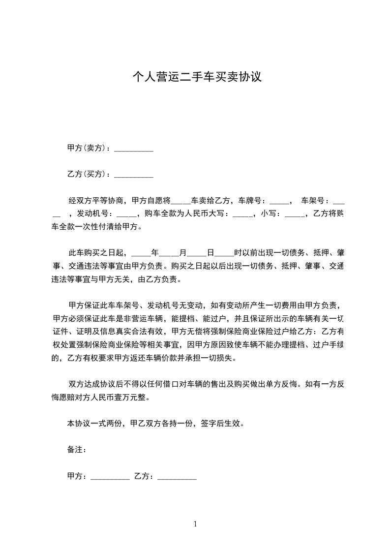 经双方平等协商,甲方自愿将_____车卖给乙方,车牌号:_____, 车架号:_____ ,发动机号:_____,购车全款为人民币大写:_____,小写:_____,乙方将购车全款一次性付清给甲方。