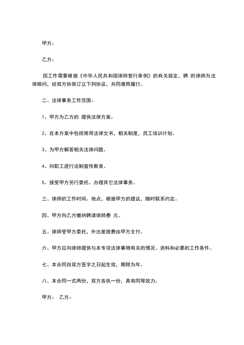 第十条:甲方无故终止合同,法律顾问费不予退还。
