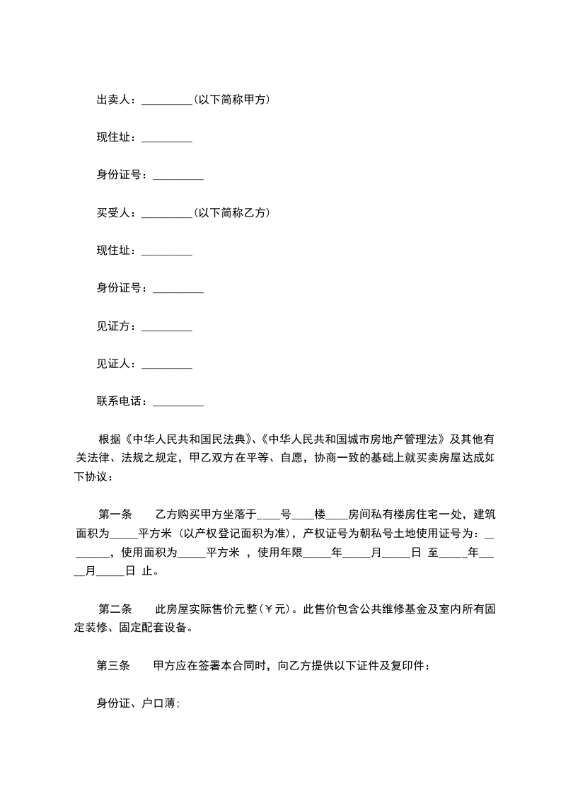 第一条乙方购买甲方坐落于____________号楼_______房间私有楼房住宅一处,建筑面积为_________平方米(以产权登记面积为准),产权证号为____________朝私________号________土地使用证号为:____________,使用面积为________平方米,使用年限_____年_____月____日至____年_____月____日止。