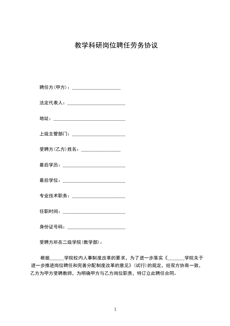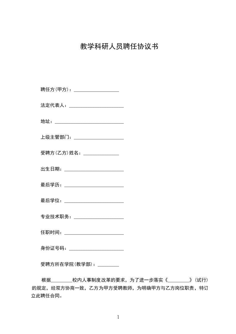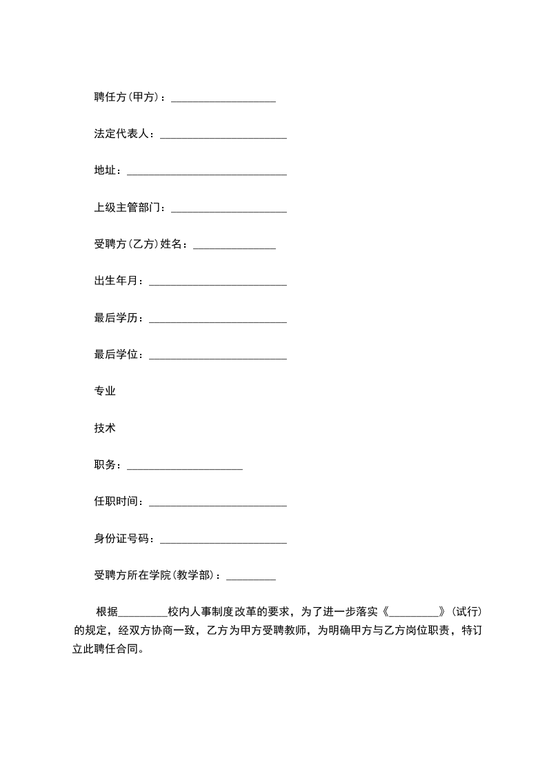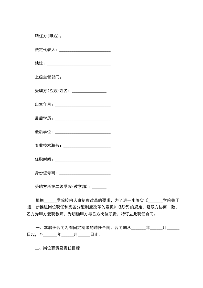 根据_________校内人事制度改革的要求,为了进一步落实《_________》(试行)的规定,经双方协商一致,乙方为甲方受聘教师,为明确甲方与乙方岗位职责,特订立此聘任合同。