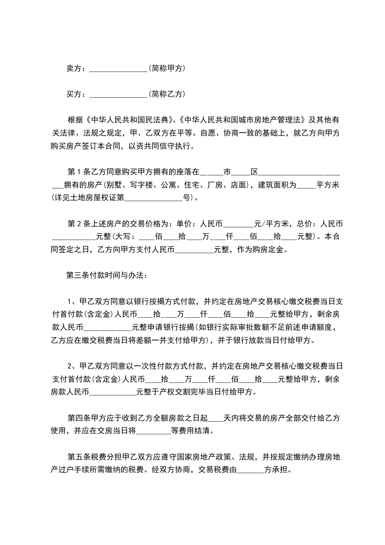 根据《中华人民共和国民法典》、《中华人民共和国城市房地产管理法》及其他有关法律、法规之规定,甲、乙双方在平等、自愿、协商一致的基础上,就乙方向甲方购买房产签订本合同,以资共同信守执行。
