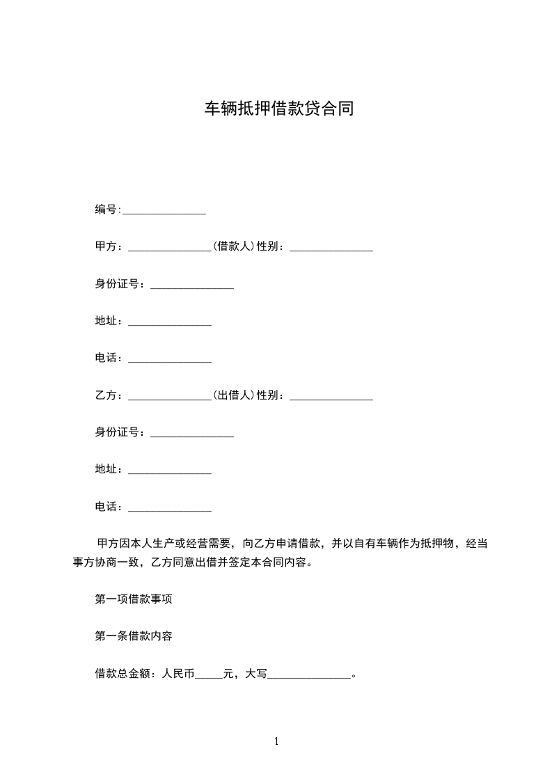 甲方因本人生产或经营需要,向乙方申请借款,并以自有车辆作为抵押物,经当事方协商一致,乙方同意出借并签定本合同内容。