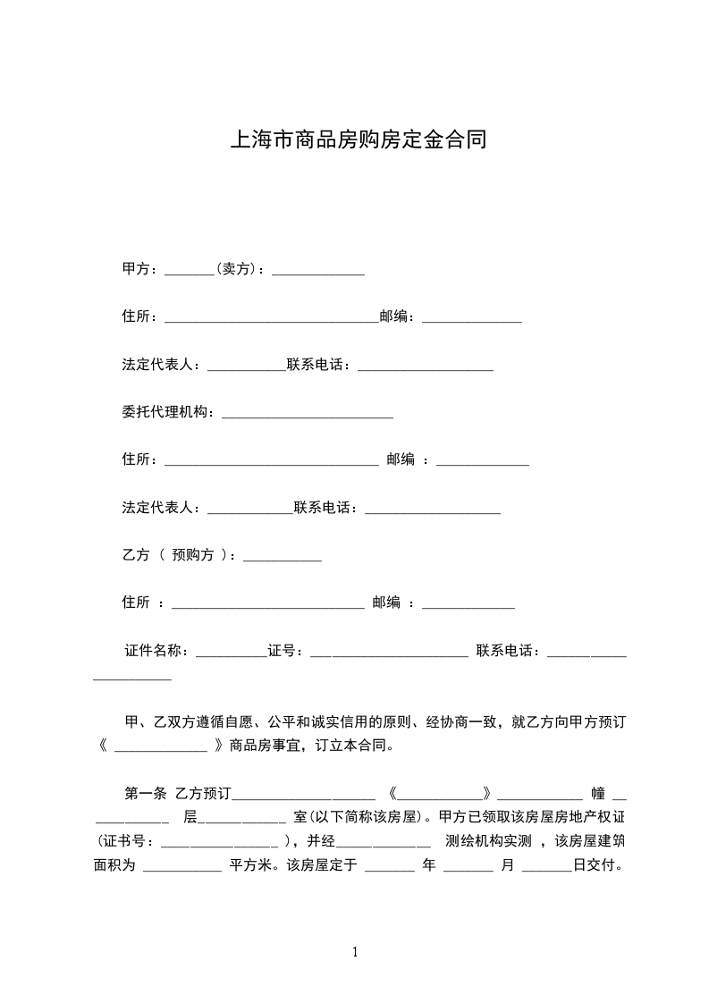 第四条 甲、乙双方商定,预订期为 ______天,乙方于______ 年______月______ 日前到 ___________________________________________ 与甲方签订《上海市商品房出售合同》。