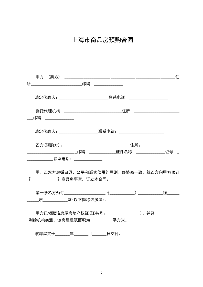 第一条 乙方预订____________________ 《____________》____________ 幢 ____________ 层____________ 室(以下简称该房屋)。甲方已领取该房屋房地产权证 (证书号:________________ ),并经_____________ 测绘机构实测 ,该房屋建筑面积为 ___________ 平方米。该房屋定于 _______ 年 _______ 月 _______日交付。