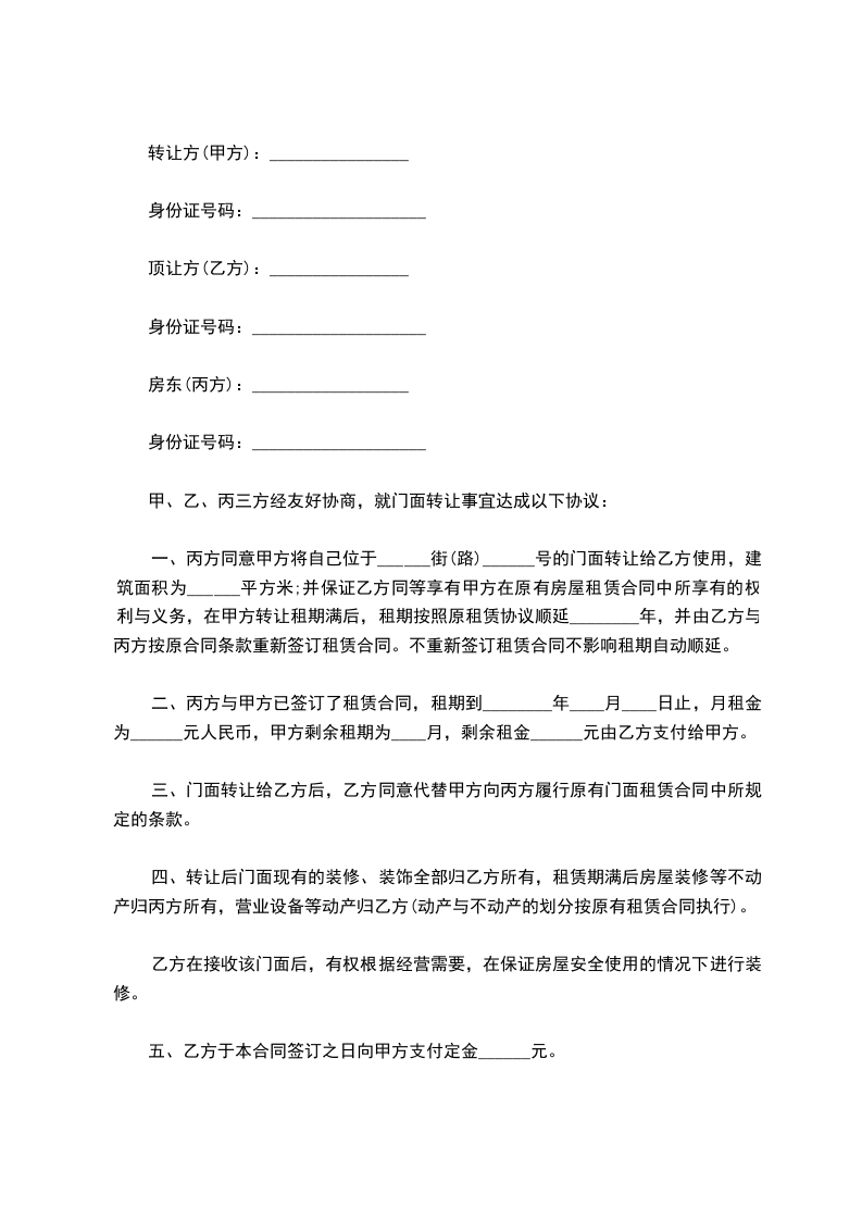 2、房租到期时,甲方义务带领乙方交付房租,并保证原有的租赁合同约定金额及租期不变。如出租方不能履行之前合同,提前收回房屋,视为甲方违约并支付乙方__%转让总价款违约金。