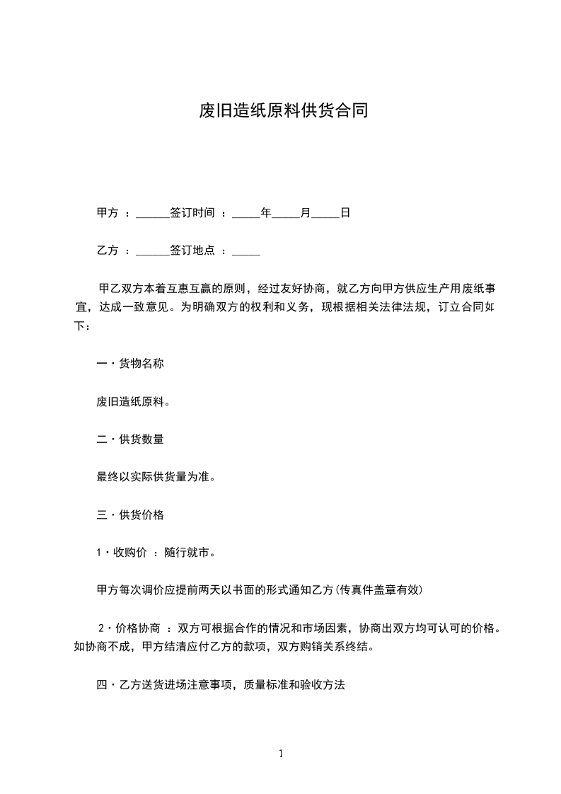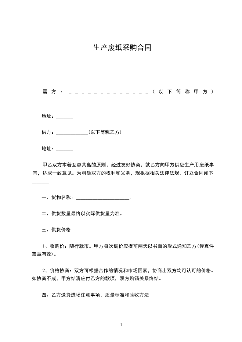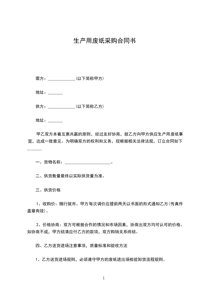 甲乙双方本着互惠共赢的原则,经过友好协商,就乙方向甲方供应生产用废纸事宜,达成一致意见。为明确双方的权利和义务,现根据相关法律法规,订立合同如下: