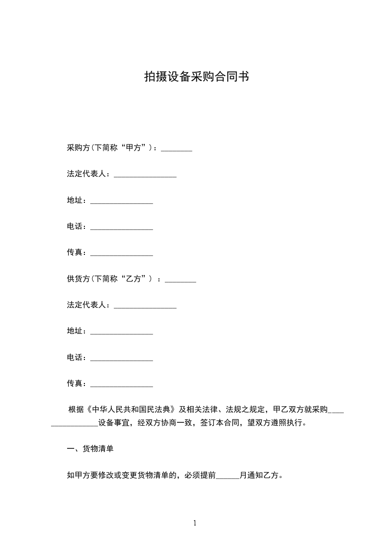 根据《中华人民共和国民法典》及相关法律、法规之规定,甲乙双方就采购________________设备事宜,经双方协商一致,签订本合同,望双方遵照执行。