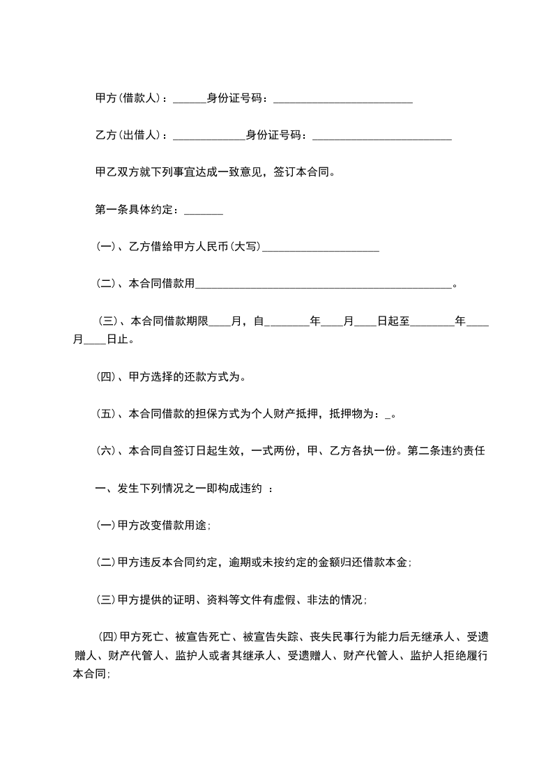 (五)、本合同借款的担保方式为个人财产抵押,抵押物为:_。