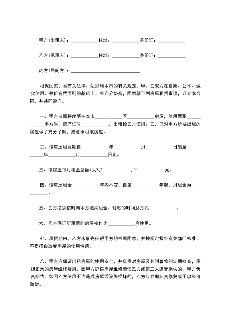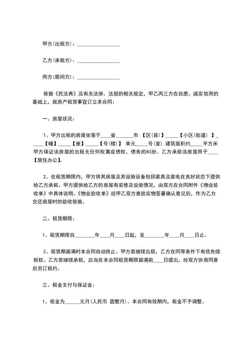 依据《民法典》及有关法律、法规的相关规定,甲乙丙三方在自愿、诚实信用的基础上,就房产租赁事宜订立本合同: