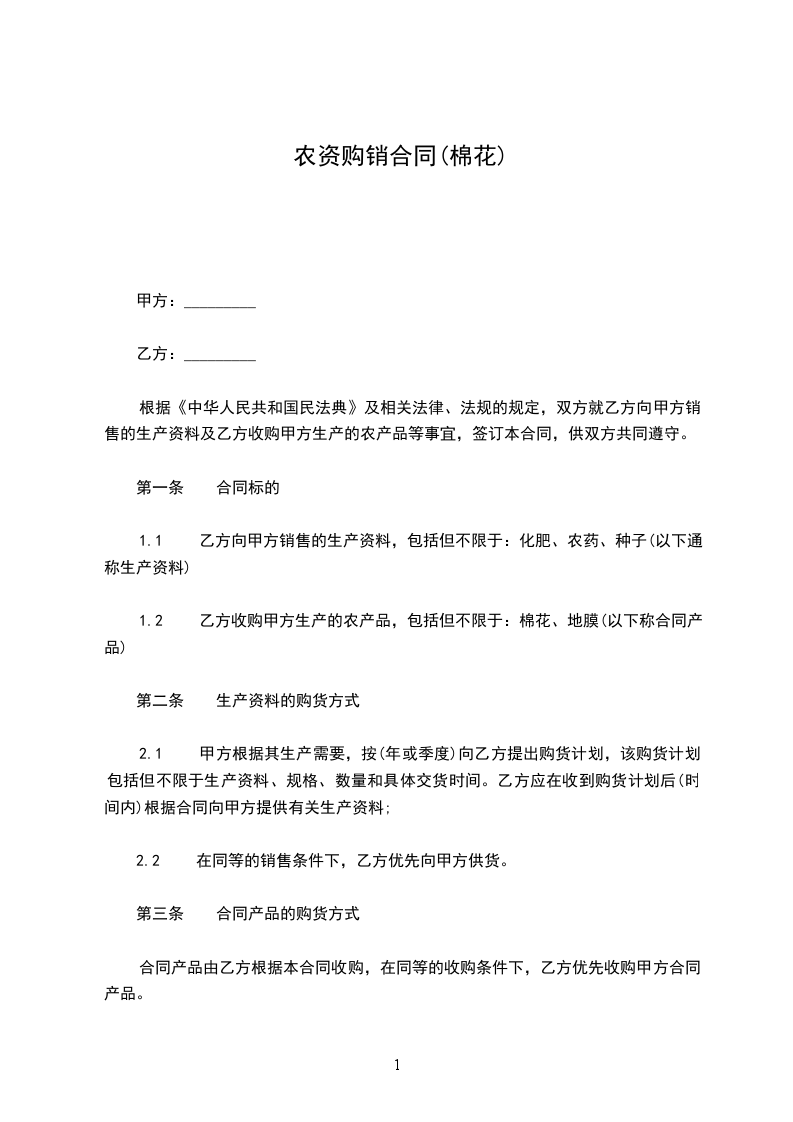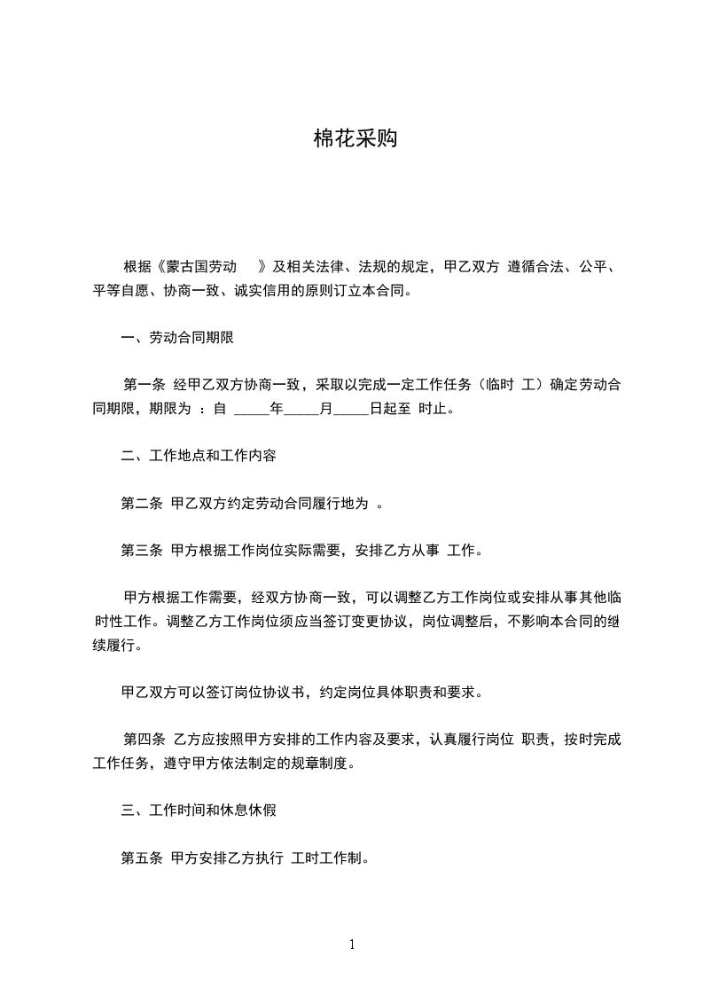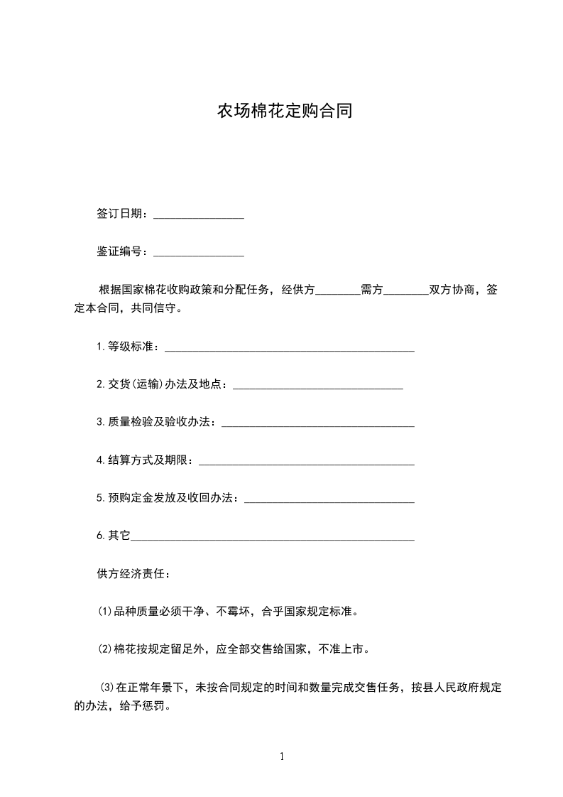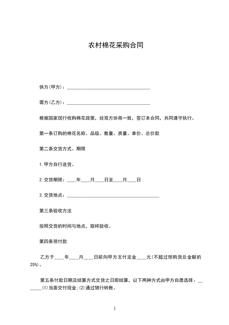 第一条 定购的棉花名称:_________;品级:_________;数量:_________;质量:_________;单价:_________;总价款:_________元。