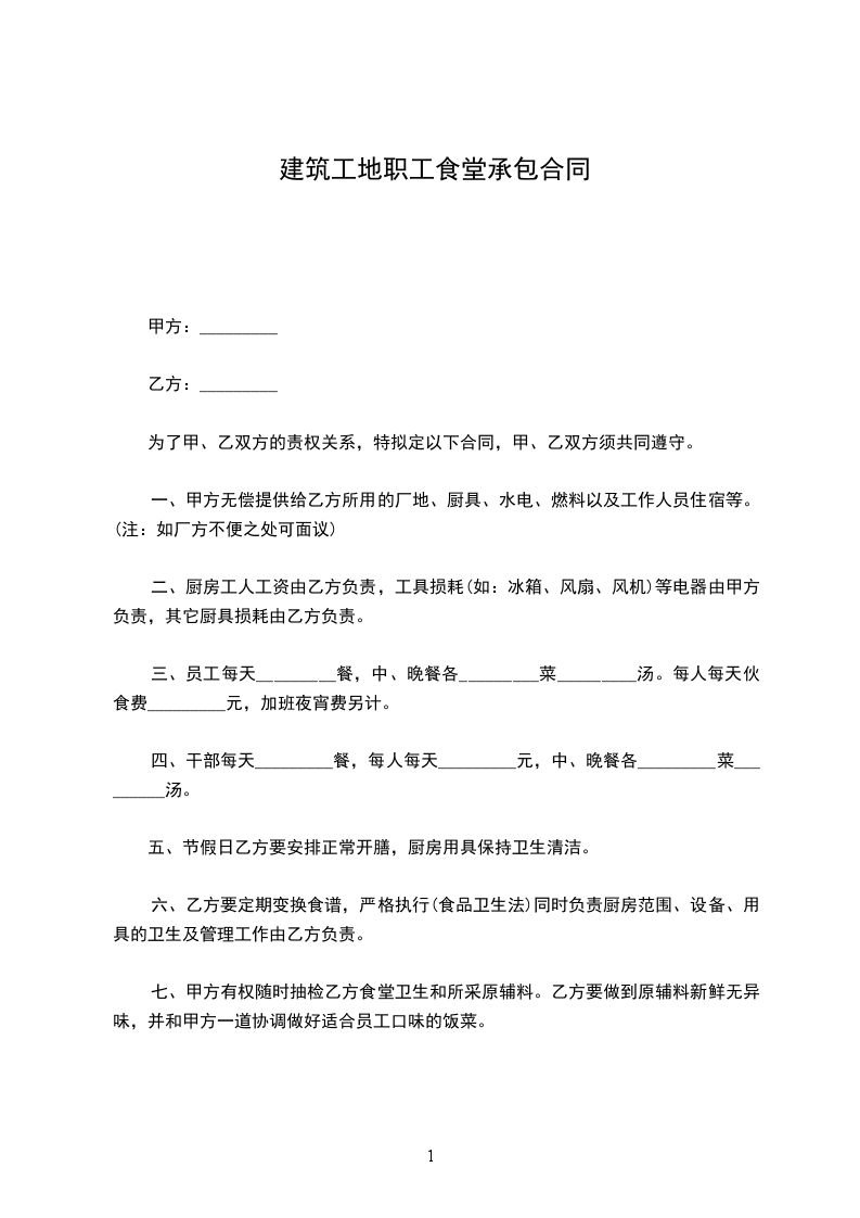 一、甲方无偿提供给乙方所用的厂地、厨具、水电、燃料以及工作人员住宿等。(注:如厂方不便之处可面议)