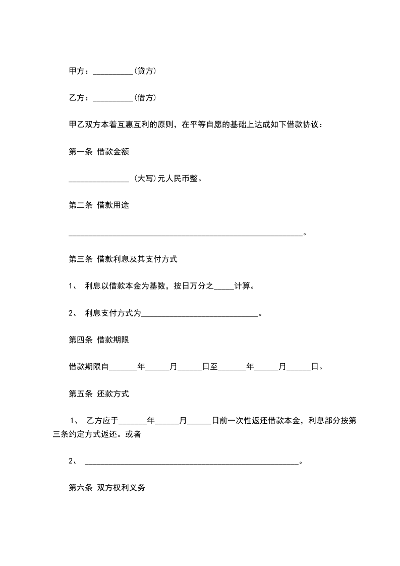 一、甲方因经营活动需要,向乙方借款人民币__________万元(¥____________),乙方于______年______月______日之前将该笔款项汇入甲方或者其指定帐号,由甲方向乙方出具收到借款的确认书。