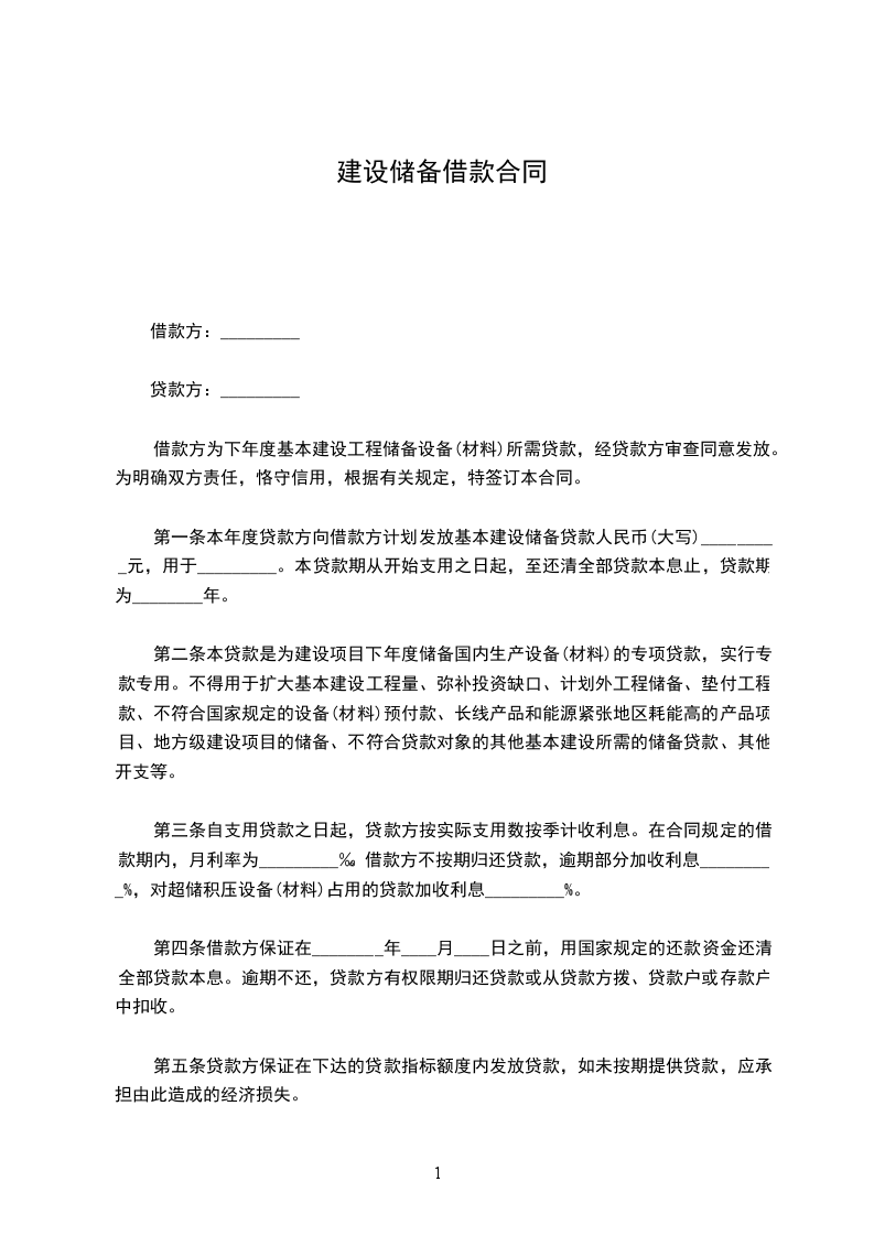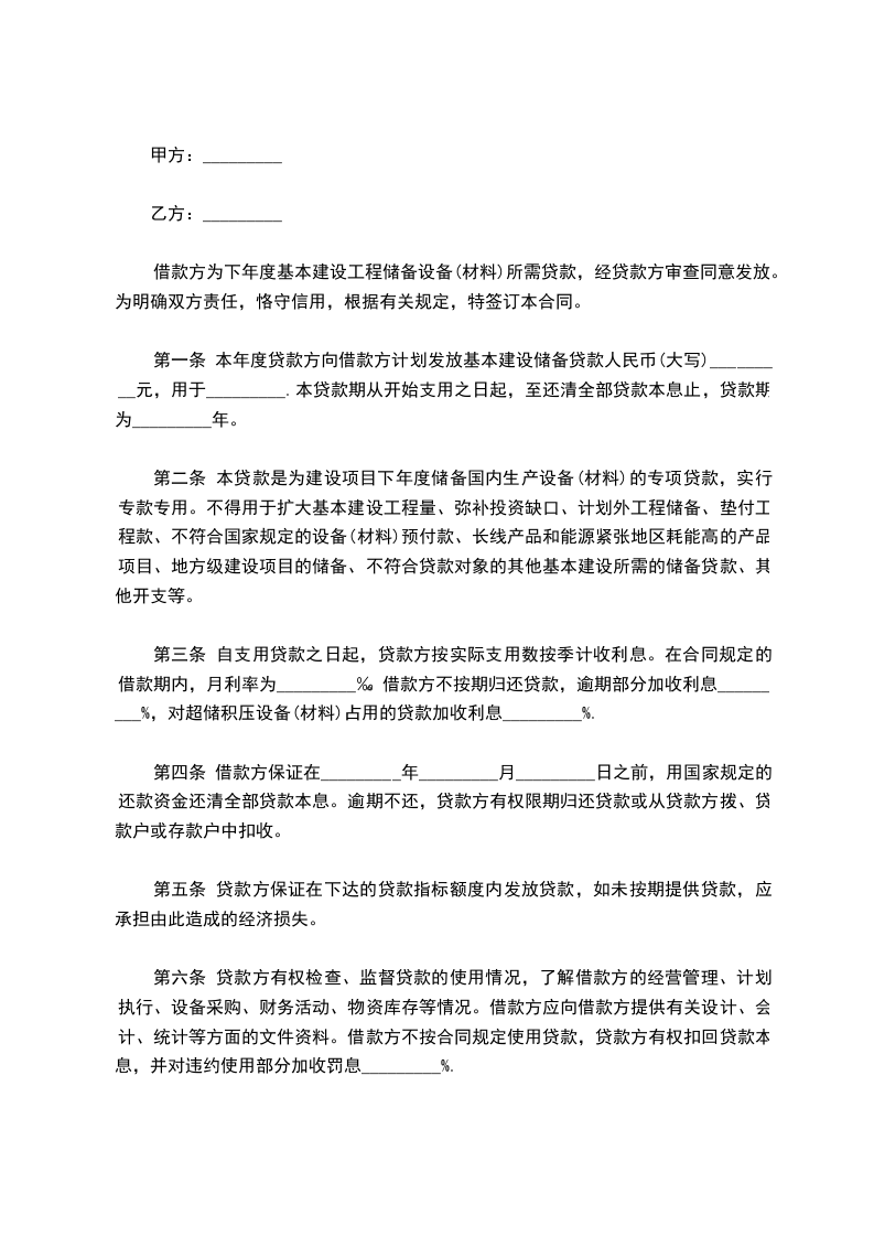 第一条 本年度贷款方向借款方计划发放基本建设储备贷款人民币(大写)_________元,用于_________.本贷款期从开始支用之日起,至还清全部贷款本息止,贷款期为_________年。