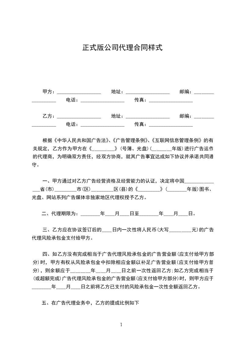 第十条 本协议一式二份,甲乙双方各一份,具有同等的法律效力,本协议自甲乙双方签名及盖章后生效,代理期限届满时自动失效。 委托方(甲方): 受托方(乙方): 地址: 地址: 电话: 电话:________年____月____日________年____月____日