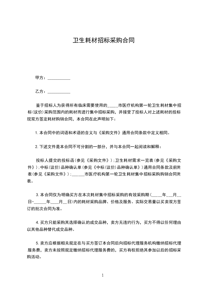 鉴于招标人为获得所有临床需要使用的_____市医疗机构第一轮卫生耗材集中招标(议价)采购范围内的耗材而进行集中招标采购,并接受了投标人对上述耗材的投标。现双方签定耗材购销合同,本合同在此声明如下: