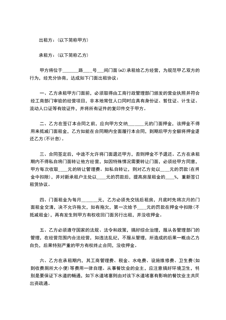 甲方将位于_______路____号___间门面(m2)承租给乙方经营,为规范甲乙双方的行为,经充分协商,达成如下门面出租协议: