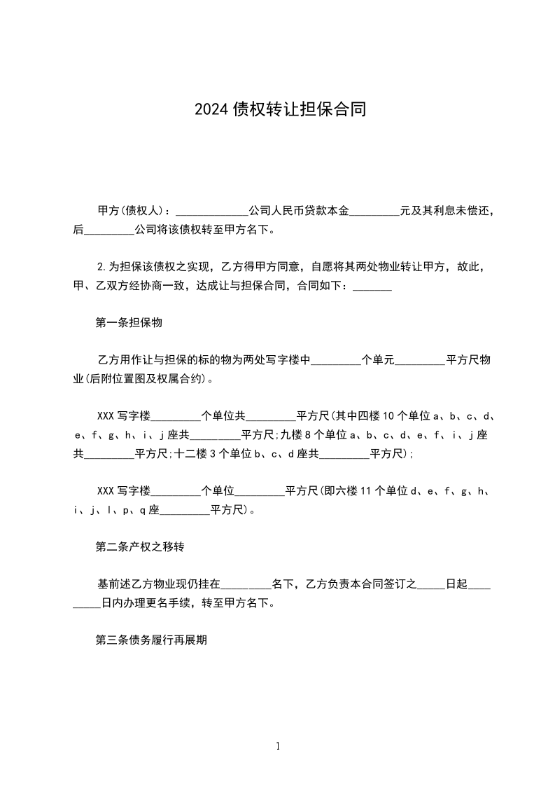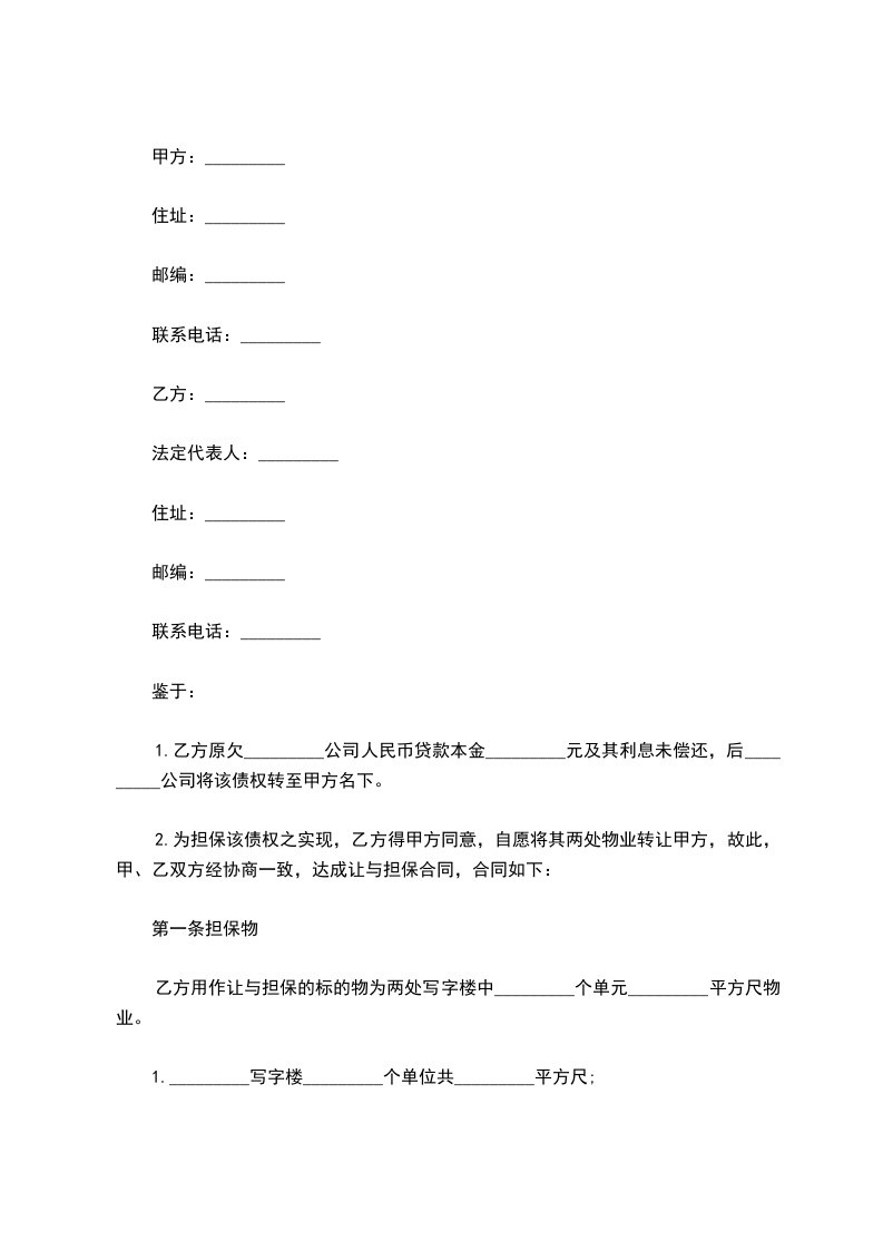 乙方用作让与担保的标的物为两处写字楼中_________个单元_________平方尺物业(后附位置图及权属合约)。