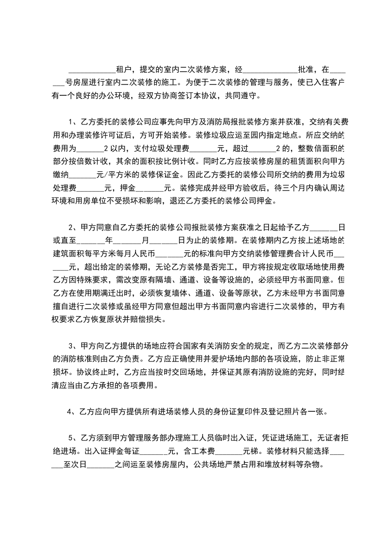 1.装修请与工程部门联系,在装修工程面积达________平方米以上并改动大楼原消防设施的租赁方应先将装修方案平面图及时送消防等有关部门审批,由消防等有关部门认可后方可施工,装修单位在装修前向工程部门送交装修报告、装修计划及有关资料,经工程部门审核,经甲方同意后方可进行装修。