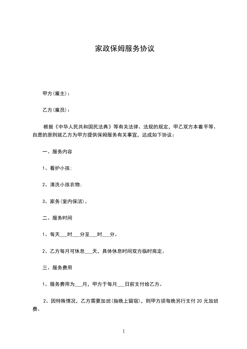 1、及时按月付给家庭服务员足额的劳务工资_______元整(具体工资数额在签定本合同时,由双方协商而定)。家庭服务员休息日每月不少于三天,遇国家规定的节、假日,不能休息的,双方协商,适当加薪。不得拖欠或扣发家庭服务员的工资。